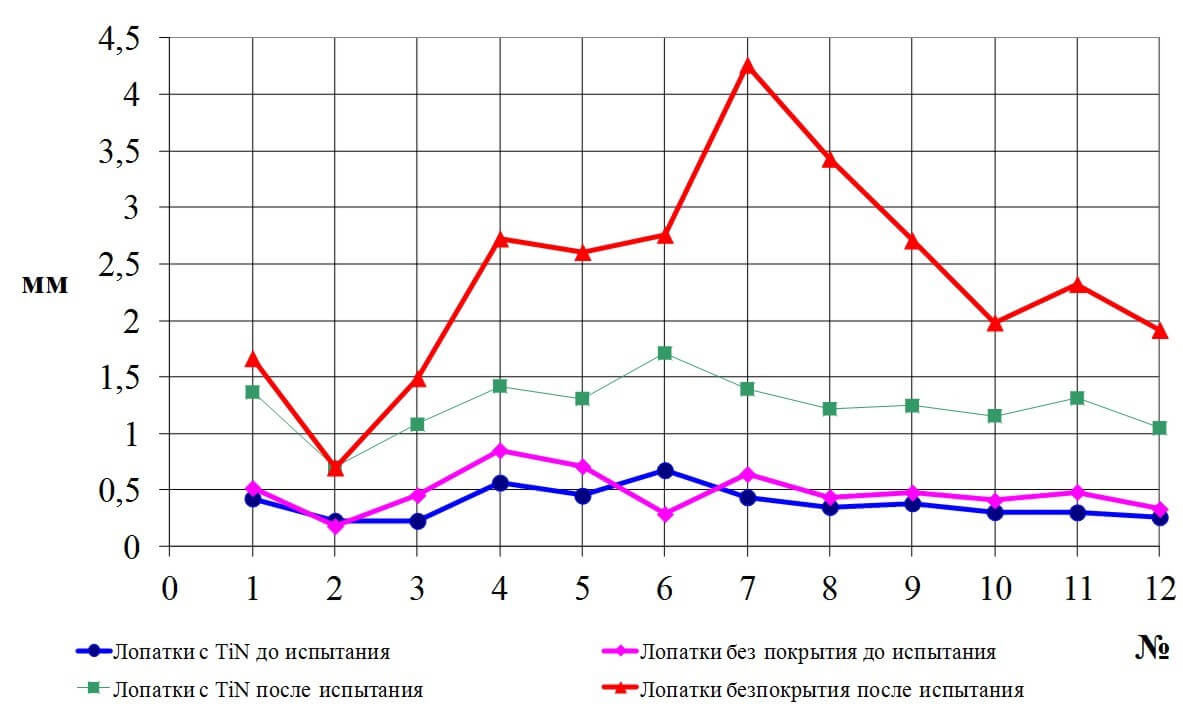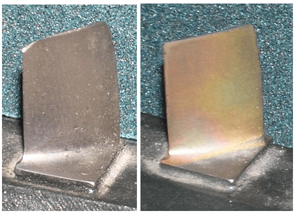 Coated and uncoated 10th stage compressor blades after 700 hours of helicopter operation in Central Asia