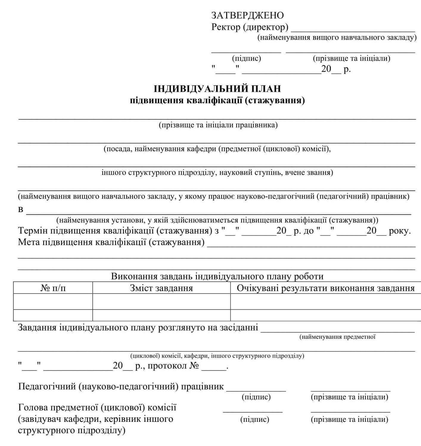 - індивідуальний план підвищення кваліфікації (стажування) за формою, наведеною в додатку 3 до цього положення, що містить інформацію про мету, завдання, термін, зміст навчання, очікувані результати.