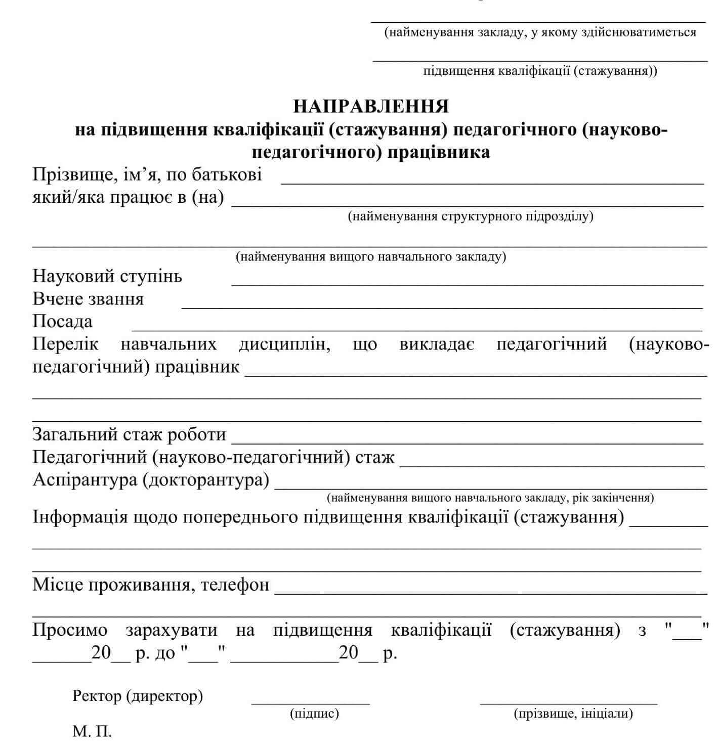 - направлення на підвищення кваліфікації (стажування) педагогічного (науково-педагогічного) працівника за формою, наведеною в додатку 2 до цього положення;