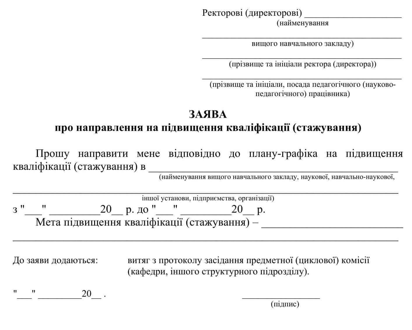 - заяву про направлення на підвищення кваліфікації (стажування) за формою, наведеною в додатку 1 до цього положення, погоджену з керівником структурного підрозділу (завідувачем кафедри), а також головним бухгалтером і керівником закладу-замовника у випадку підвищення кваліфікації працівника закладу-замовника;
