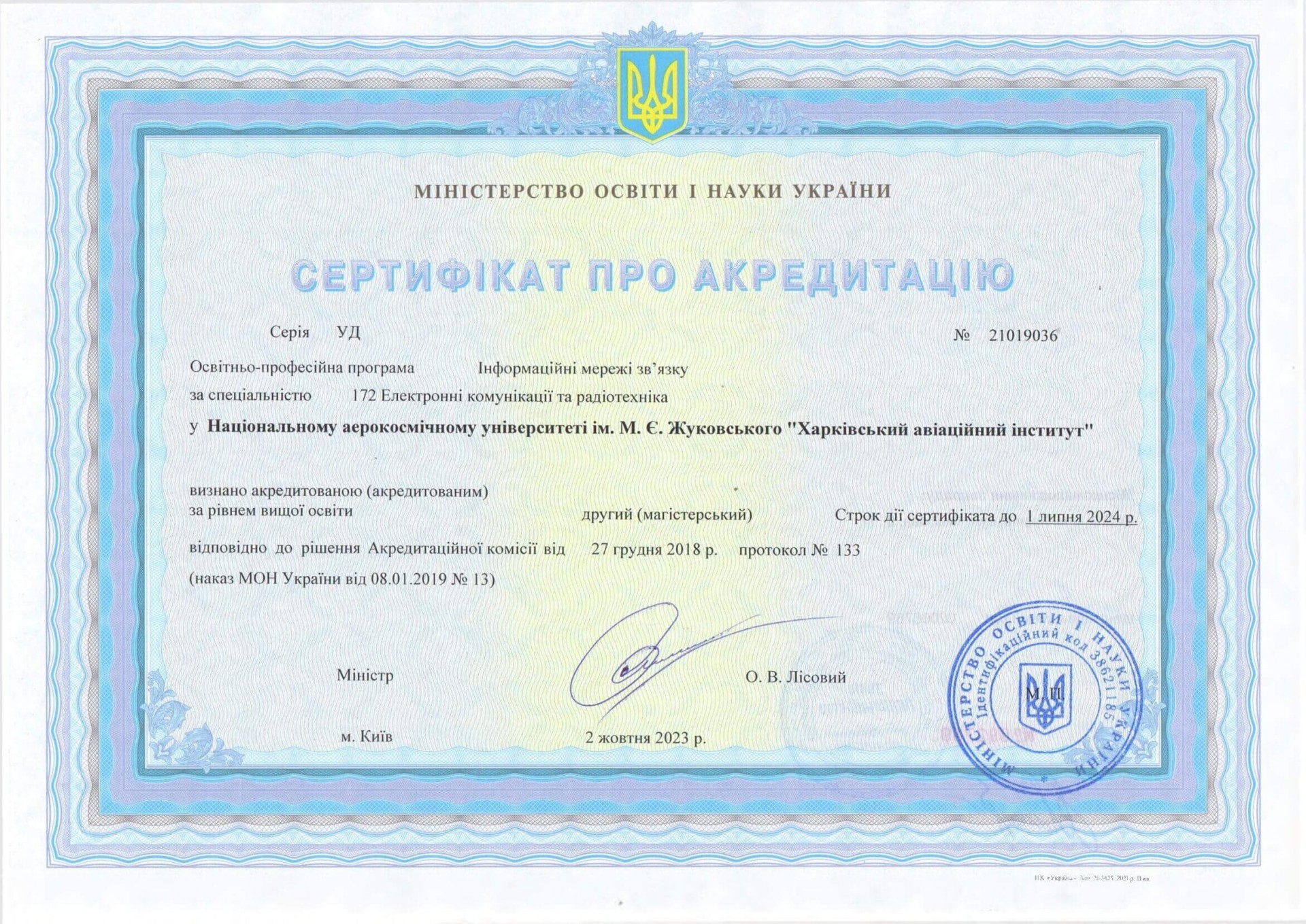 Сертифікат про акредитацію освітньо-професійної програми: УД №21019036 від 02 жовтня 2023 року, діє до 01 липня 2026 року