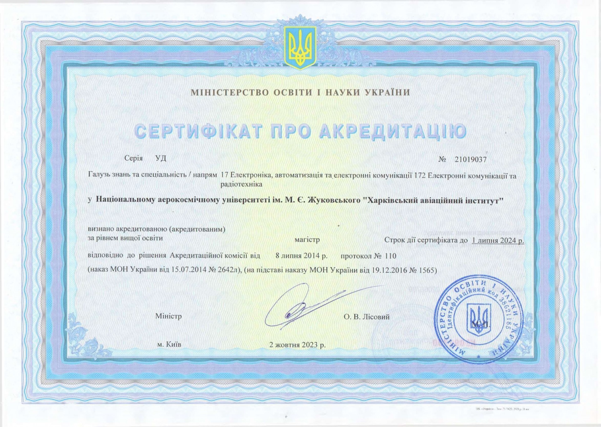 Сертифікат про акредитацію освітньо-наукової програми: УД №21019037 від 02 жовтня 2023 року, діє до 01 липня 2026 року
