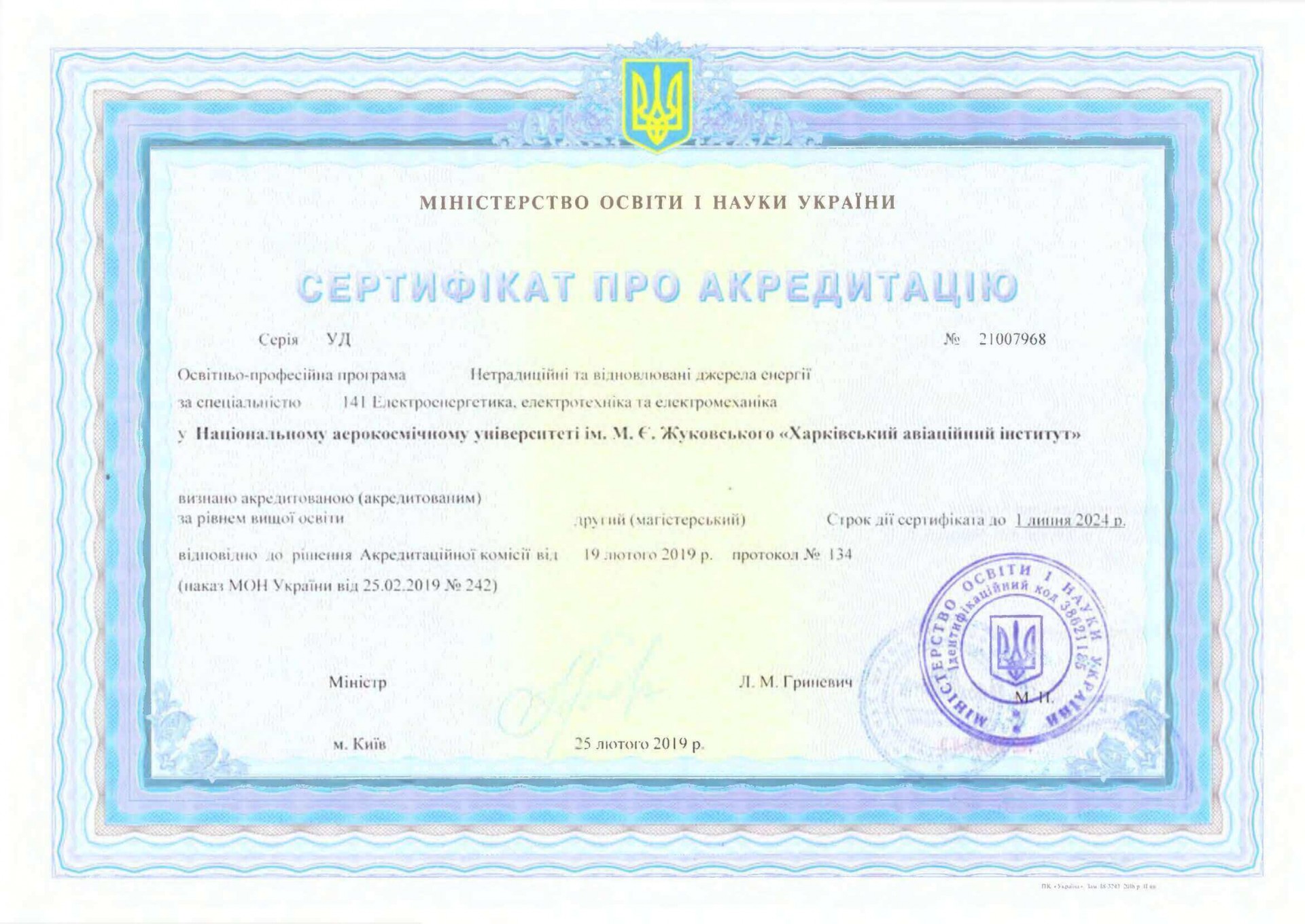 Сертифікат про акредитацію: УД №21007968 від 25 лютого 2019 року, діє до 01 липня 2026 року