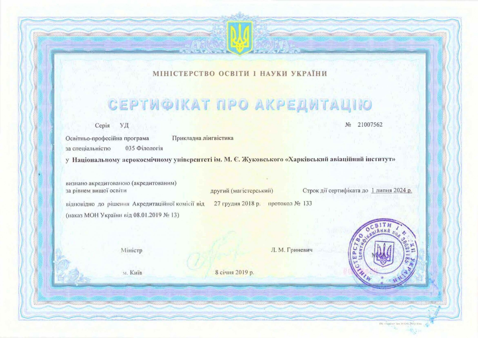 Сертифікат про акредитацію: УД №21007562 від 08 січня 2019 року, діє до 01 липня 2026 року