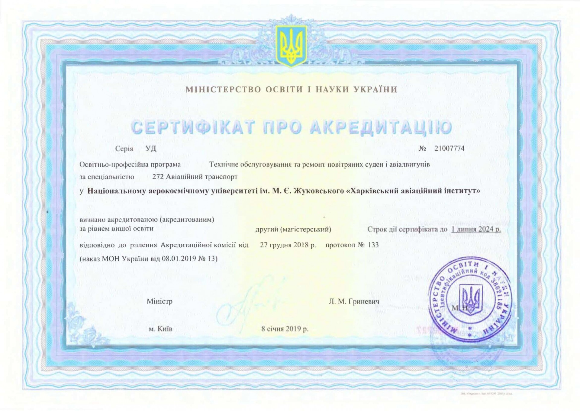 Сертифікат про акредитацію освітньо-професійної програми: УД №21007774 від 08 січня 2019 року, діє до 01 липня 2026 року