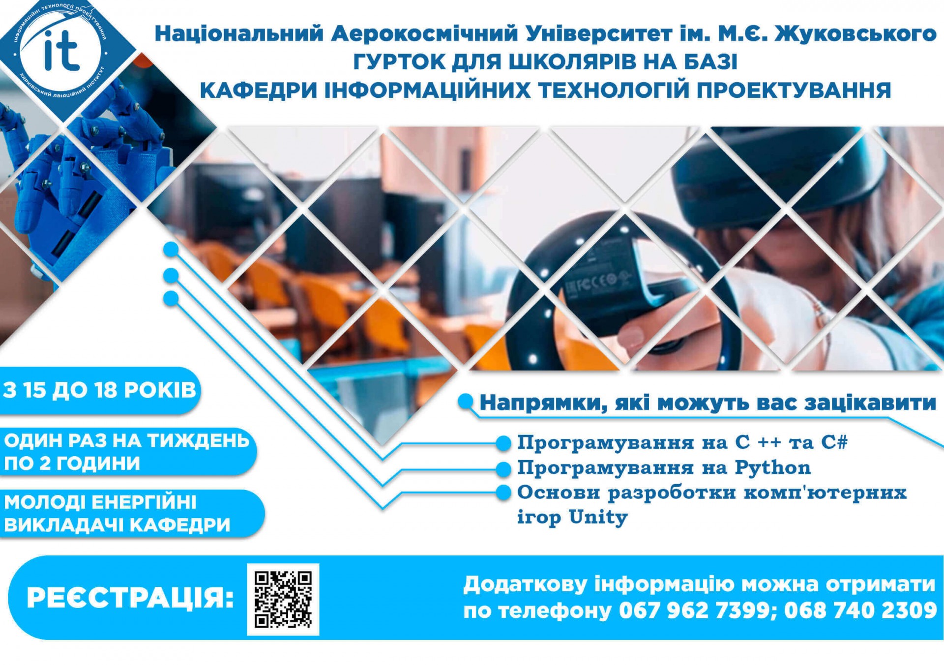 З 05.11.20 о 16:00 на кафедрі інформаційних технологій проектування Національного аерокосмічного університету "Харківський авіаційний інститут" розпочинає роботу гурток, де школярі матимуть змогу ознайомитися з сучасними технологіями розробки комп'ютерних ігор, програмування на Python, С ++ та С#.