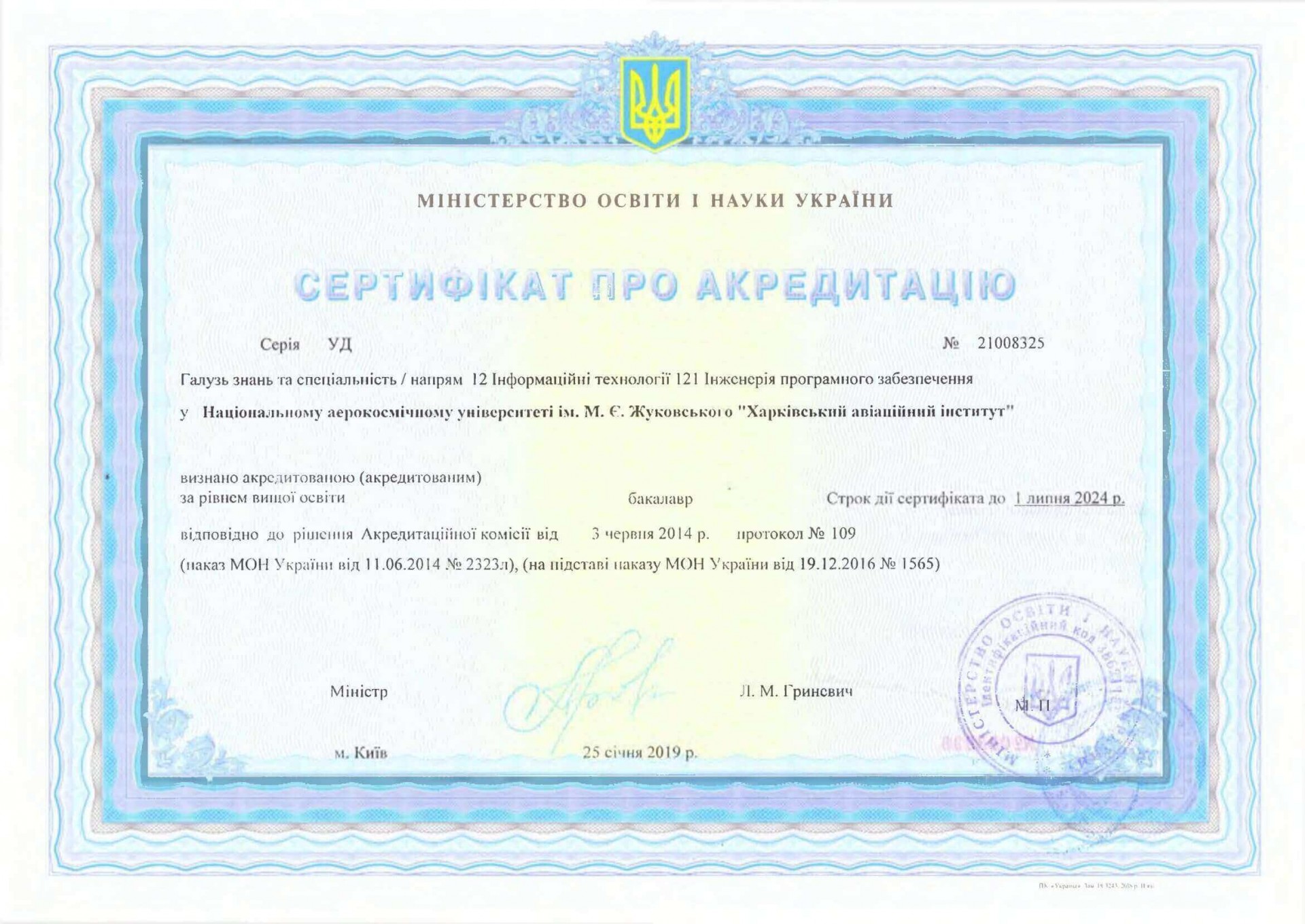 Сертифікат про акредитацію: УД №21008325 від 25 січня 2019 року, діє до 01 липня 2026 року