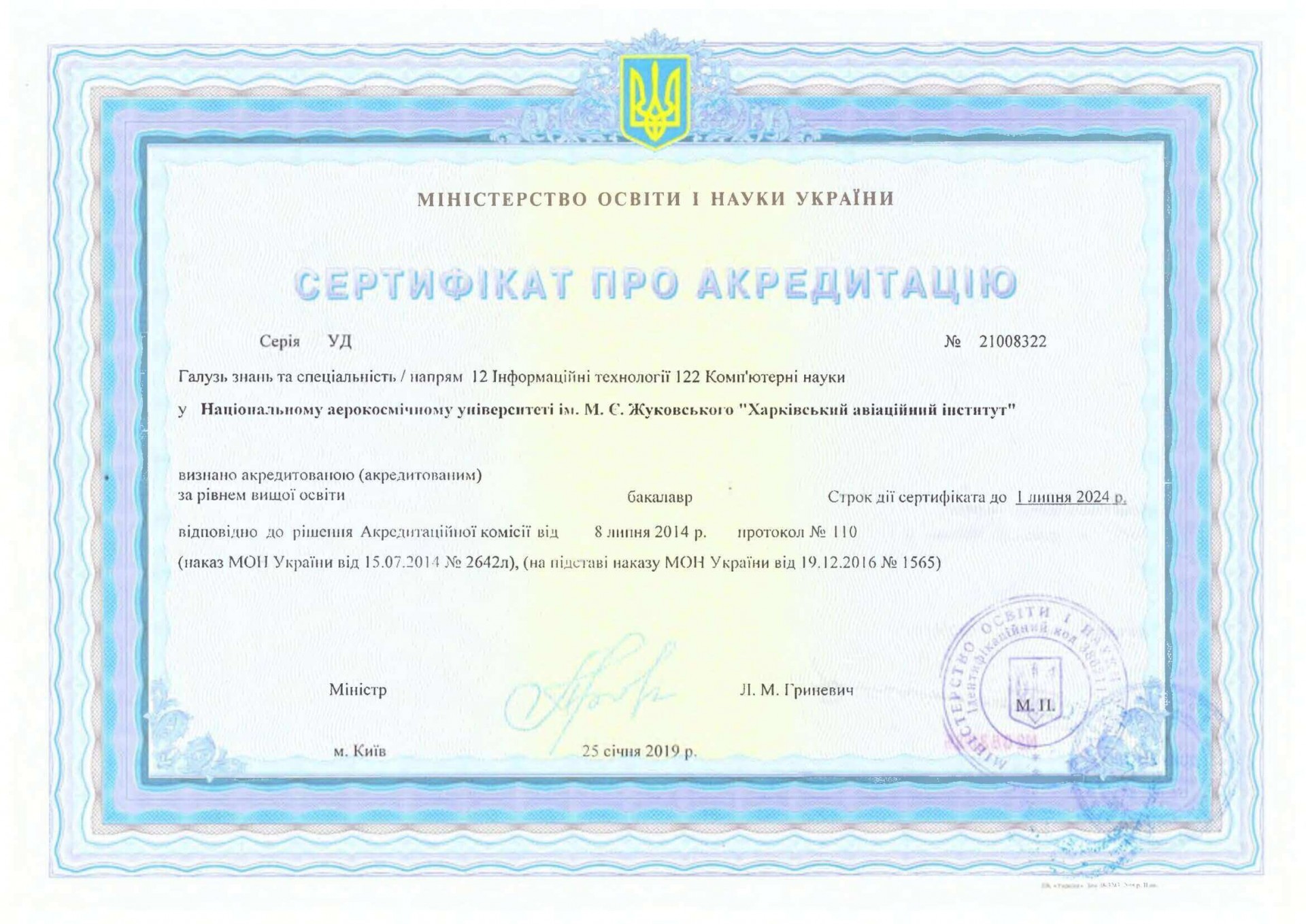 Сертифікат про акредитацію: УД №21008322 від 25 січня 2019 року, діє до 01 липня 2026 року