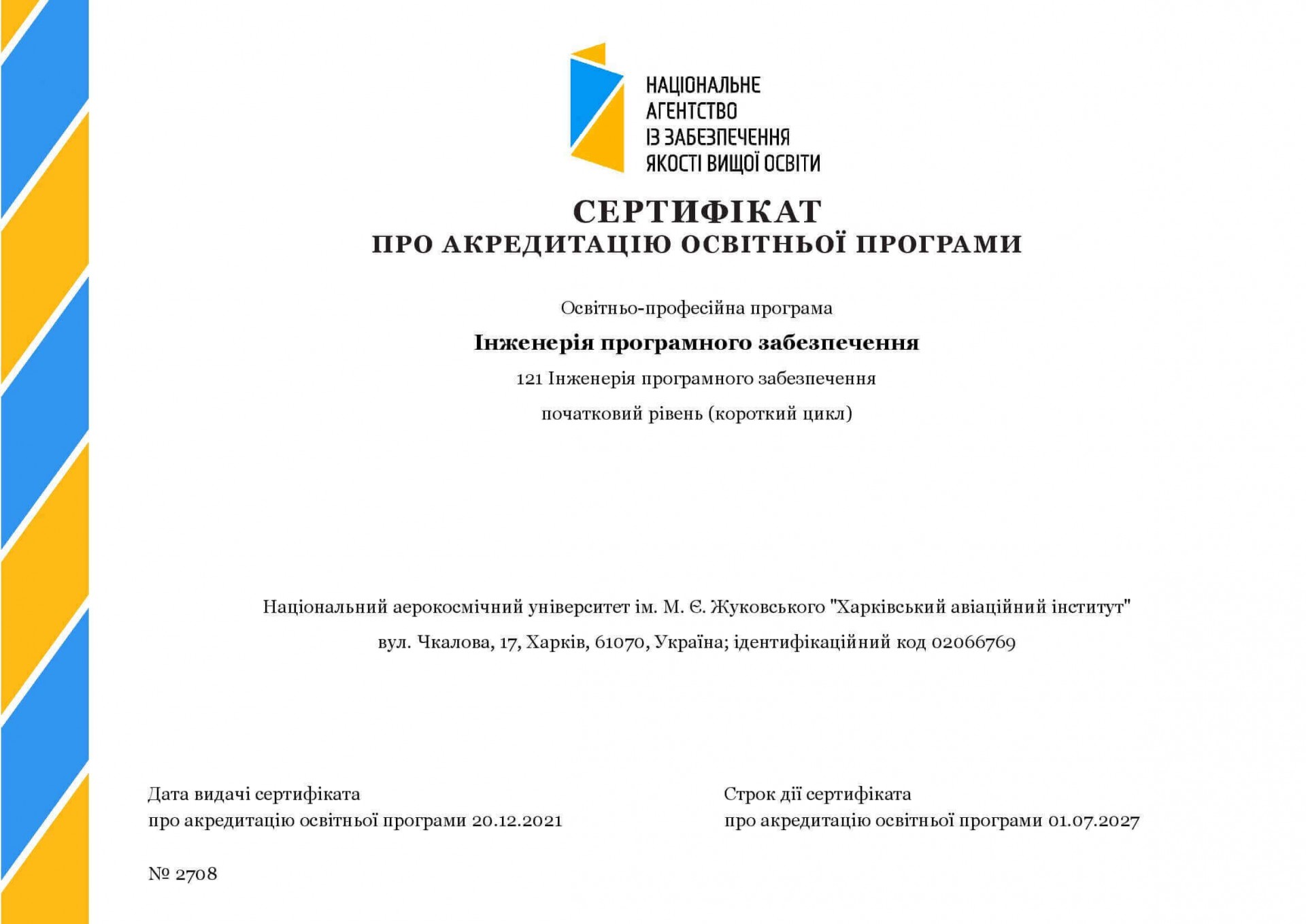 Термін дії сертифікатів про акредитацію спеціальностей/сертифікатів про акредитацію освітніх програм продовжено до 01.06.2026 р. відповідно до пункту 1 Постанови Кабінету Міністрів України «Про особливості акредитації освітніх програм, за якими здійснюють підготовку здобувачі вищої освіти, в умовах воєнного стану» від 16 березня 2022 р. № 295.