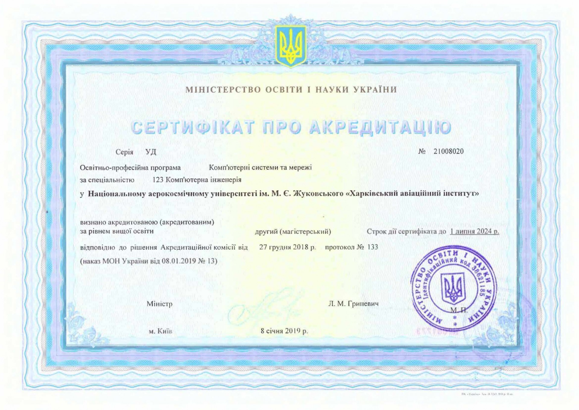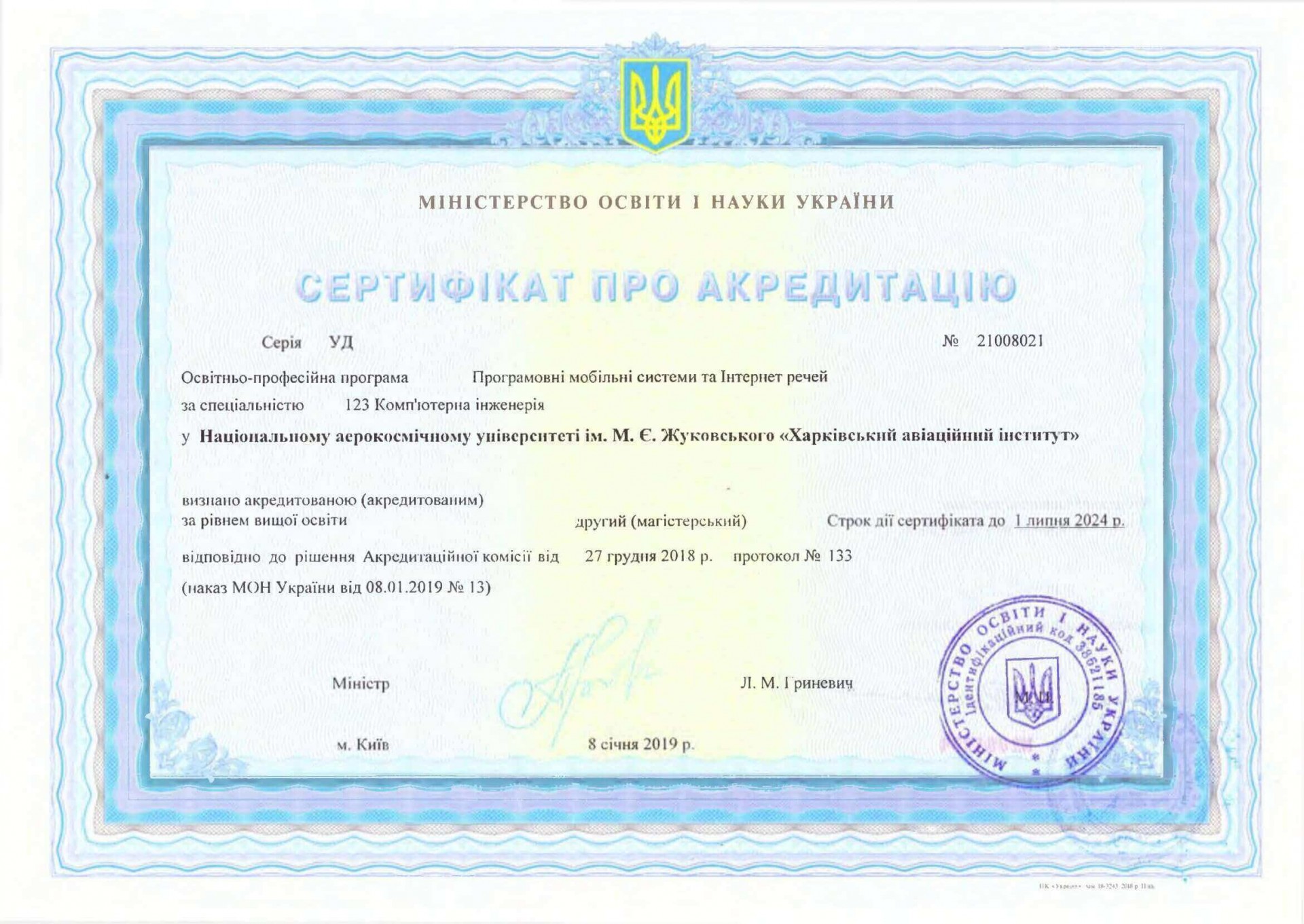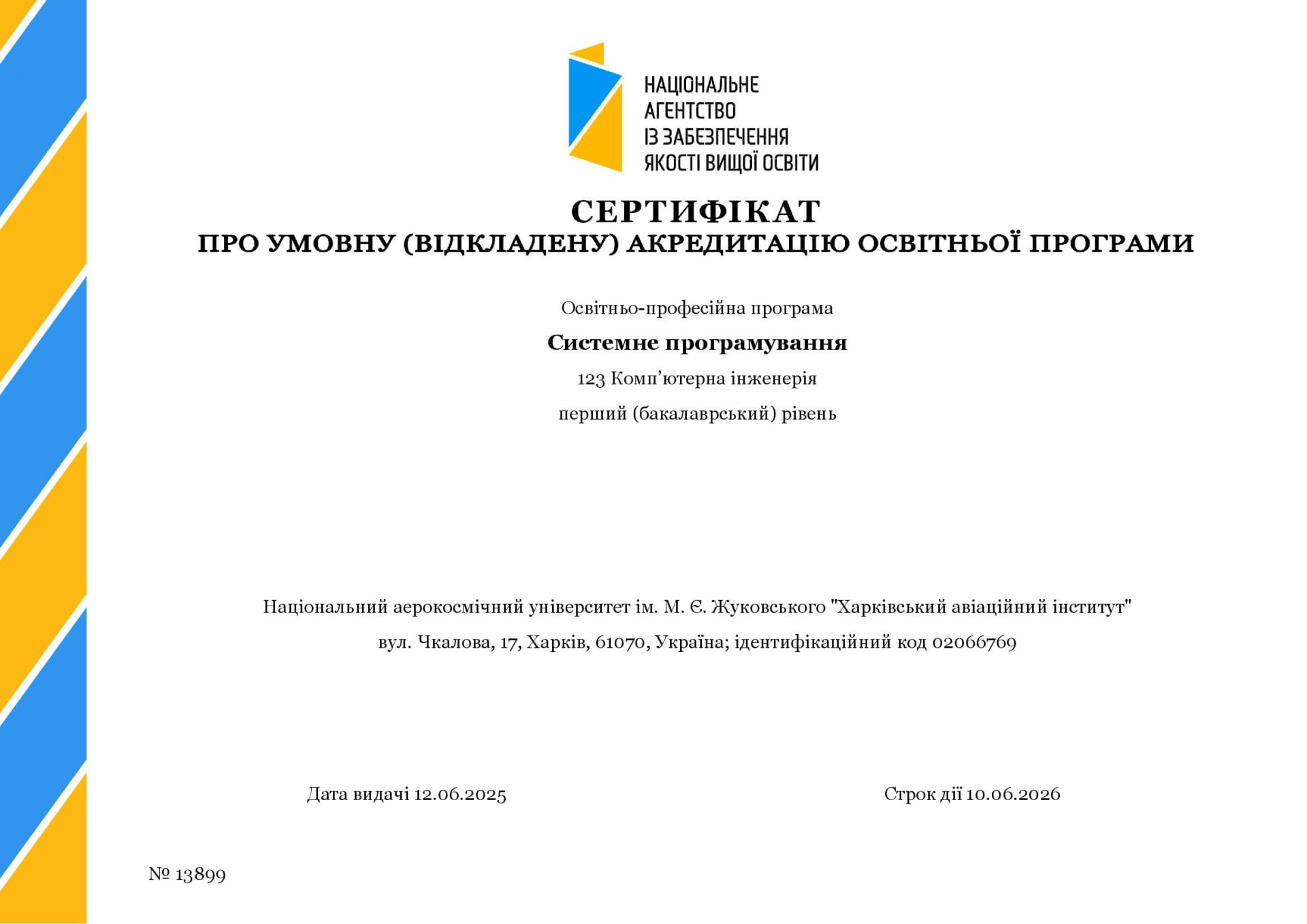 Термін дії сертифікатів про акредитацію спеціальностей/сертифікатів про акредитацію освітніх програм продовжено до 01.06.2026 р. відповідно до пункту 1 Постанови Кабінету Міністрів України «Про особливості акредитації освітніх програм, за якими здійснюють підготовку здобувачі вищої освіти, в умовах воєнного стану» від 16 березня 2022 р. № 295.