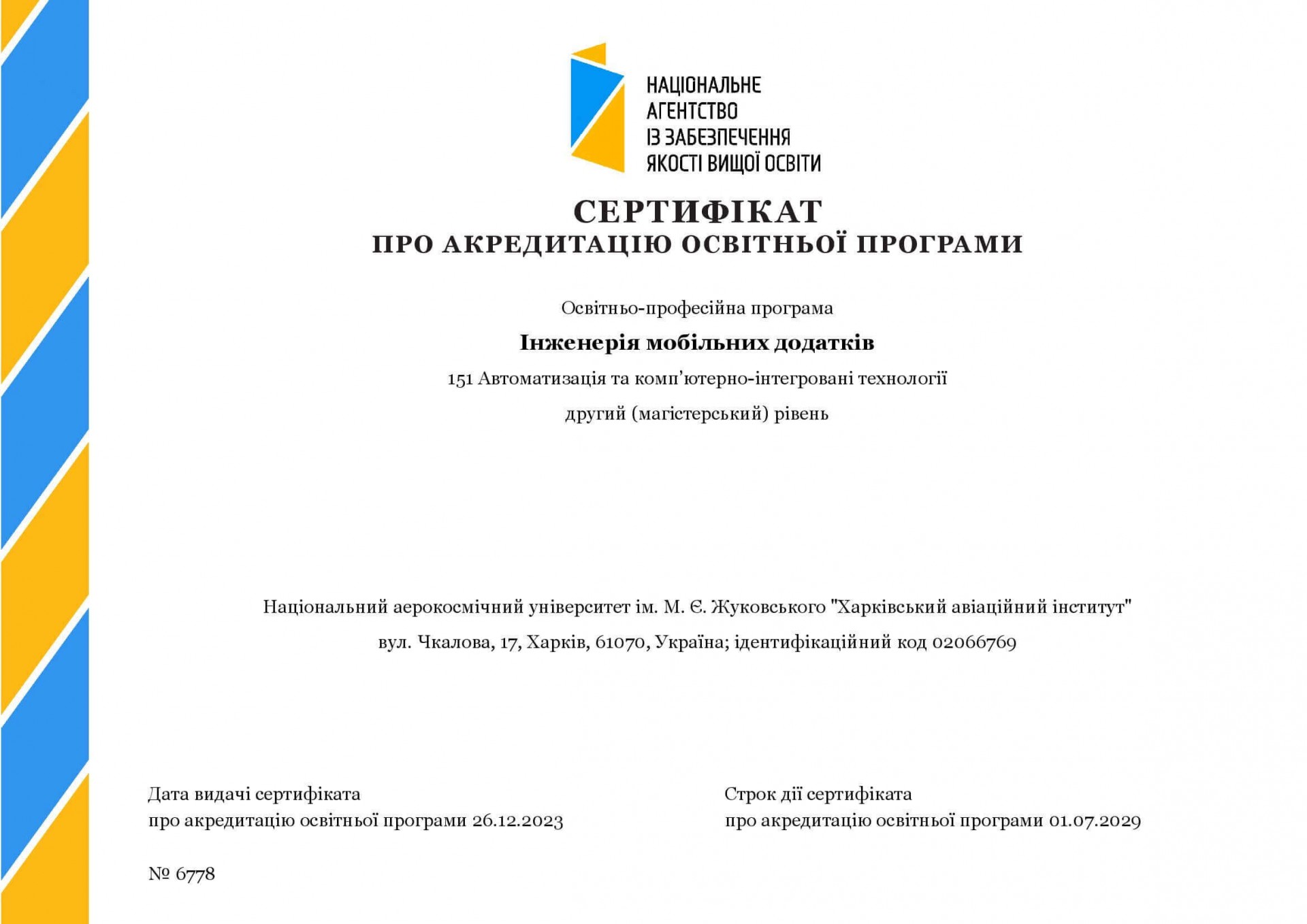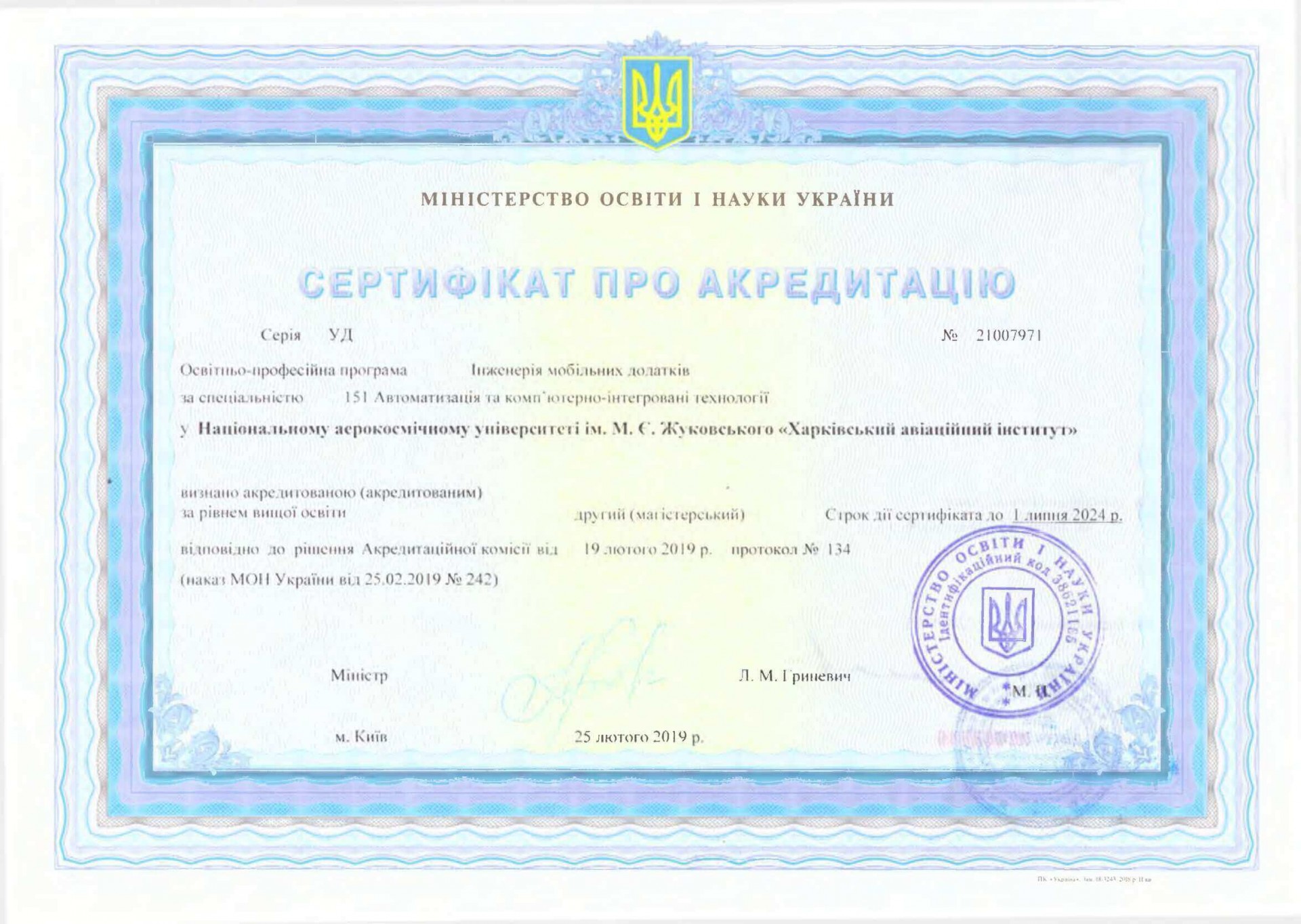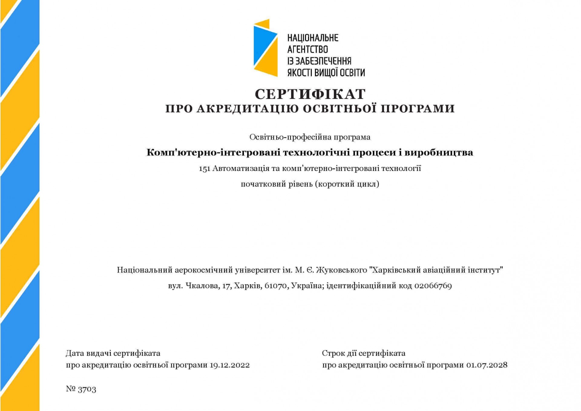 Термін дії сертифікатів про акредитацію спеціальностей/сертифікатів про акредитацію освітніх програм продовжено до 01.06.2026 р. відповідно до пункту 1 Постанови Кабінету Міністрів України «Про особливості акредитації освітніх програм, за якими здійснюють підготовку здобувачі вищої освіти, в умовах воєнного стану» від 16 березня 2022 р. № 295.