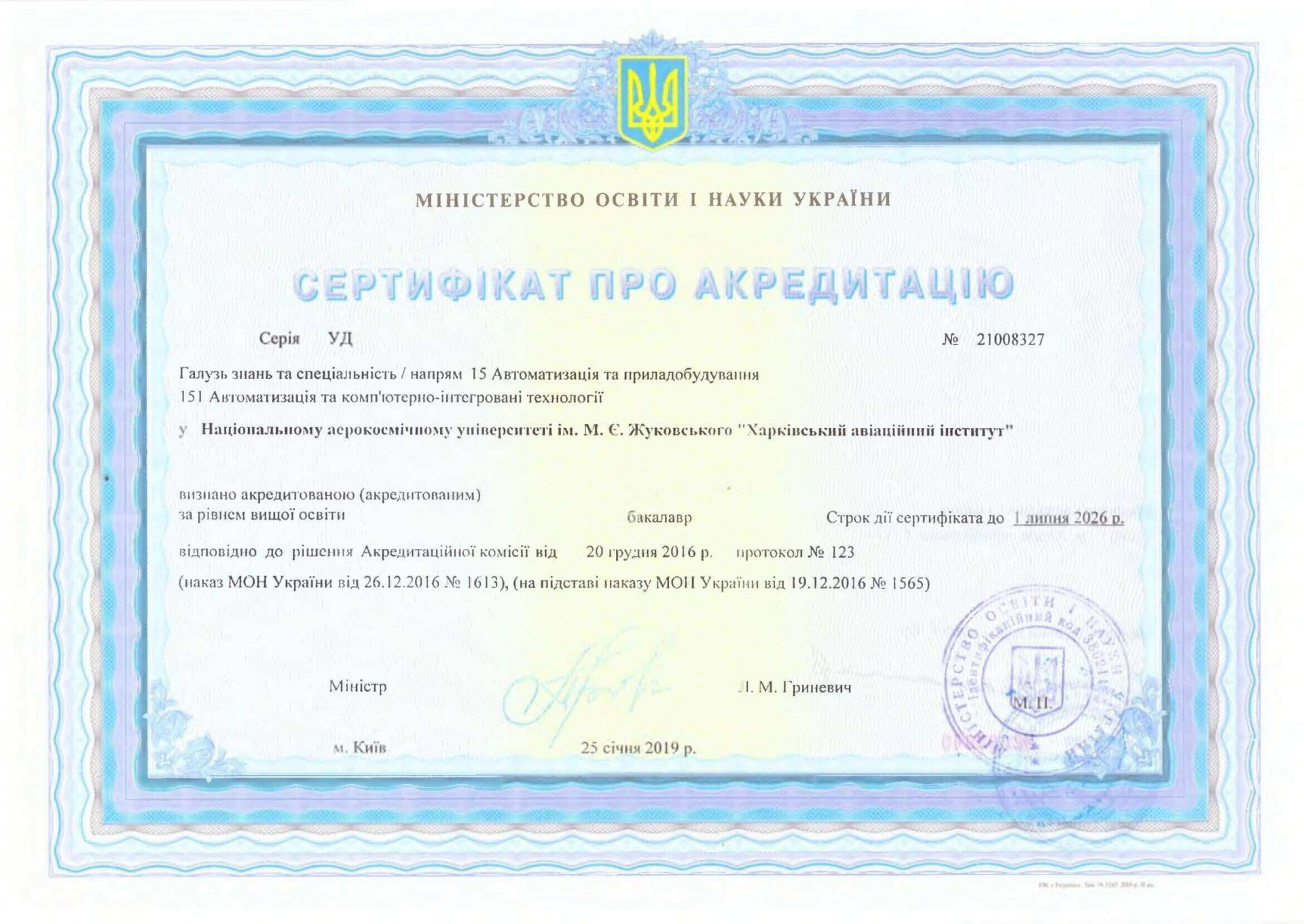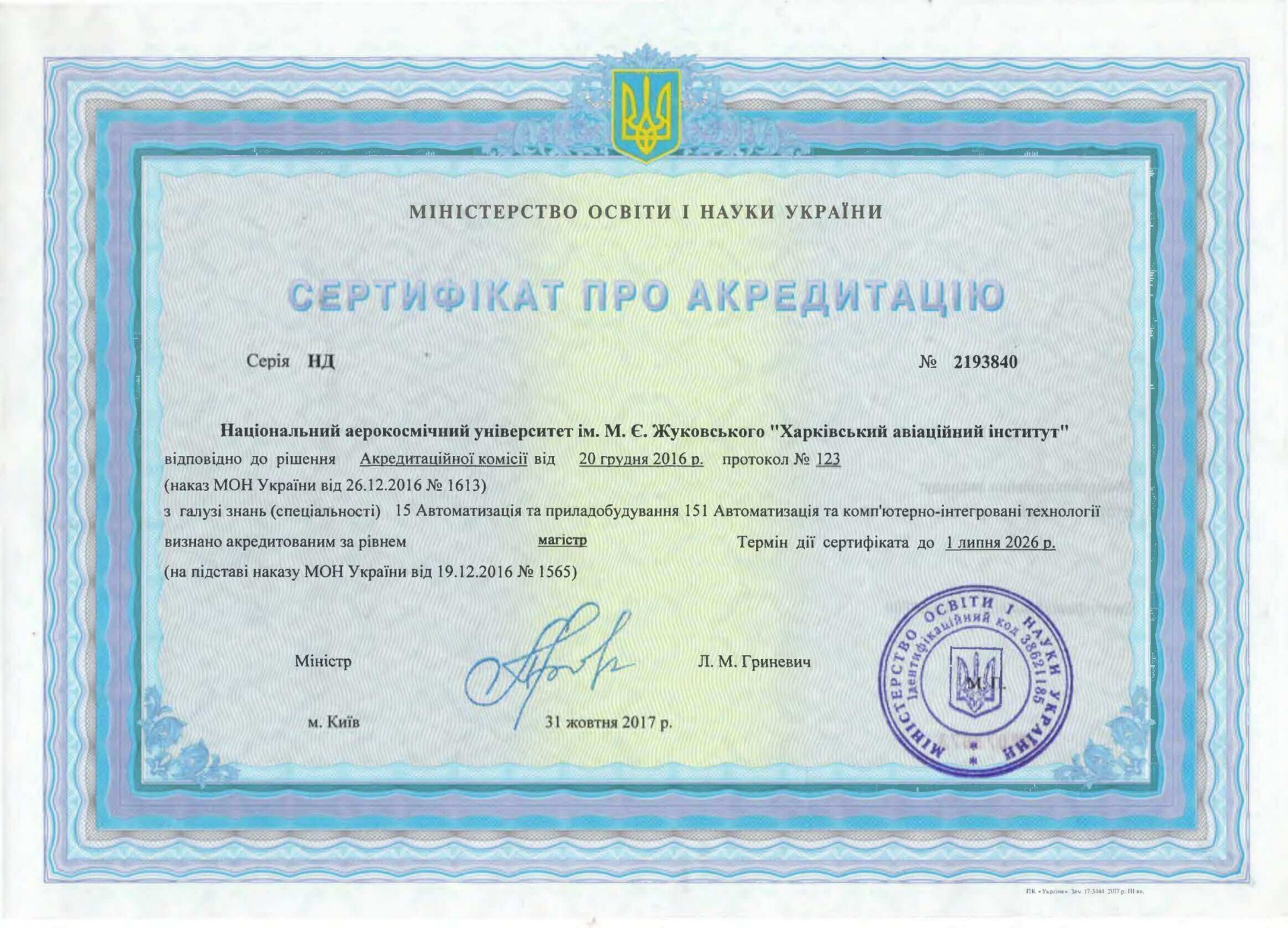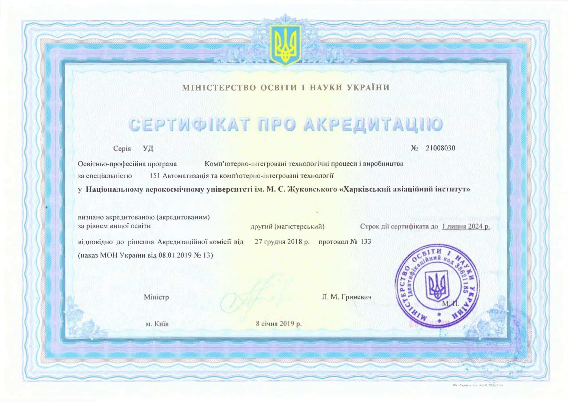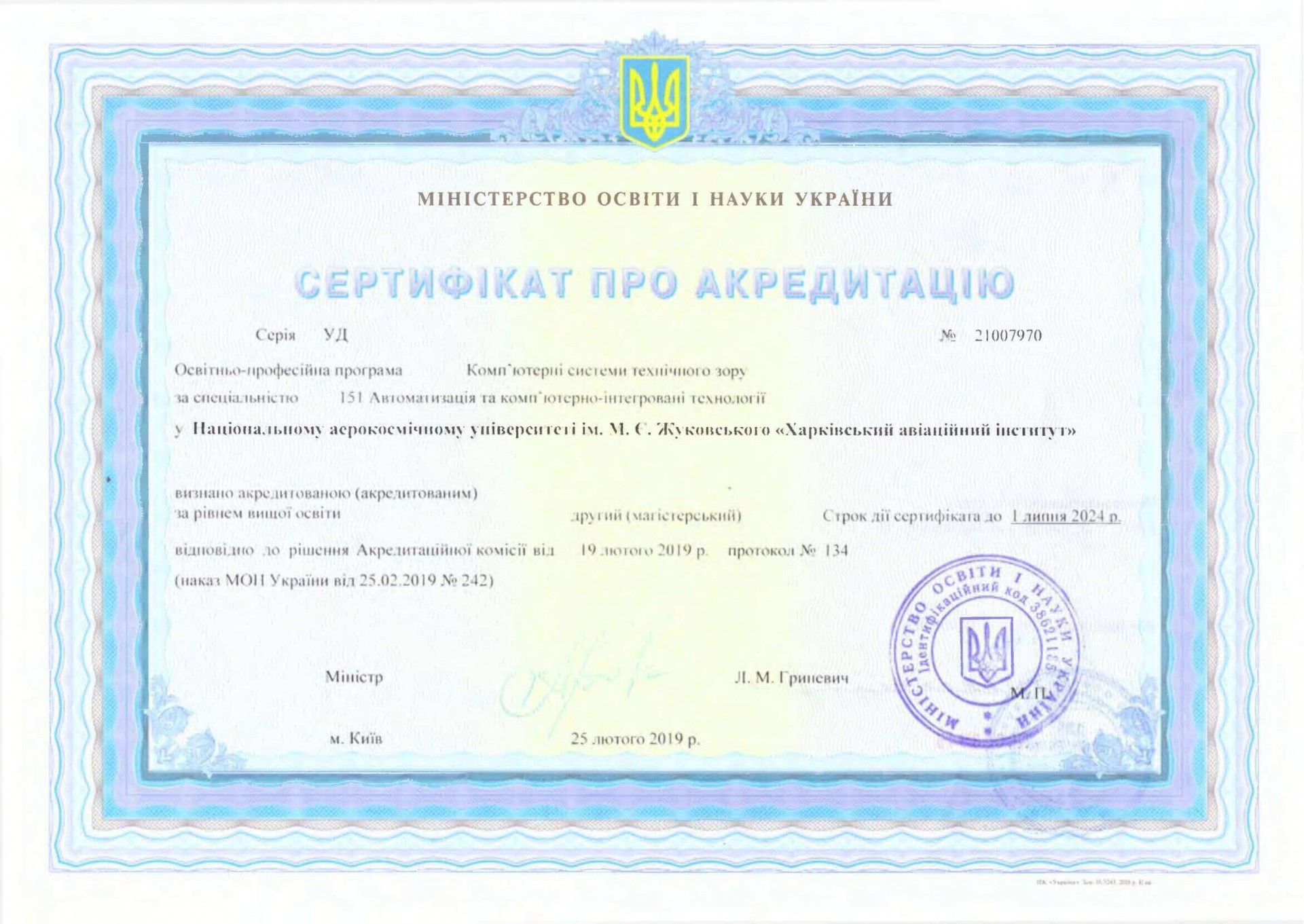 Термін дії сертифікатів про акредитацію спеціальностей/сертифікатів про акредитацію освітніх програм продовжено до 01.06.2026 р. відповідно до пункту 1 Постанови Кабінету Міністрів України «Про особливості акредитації освітніх програм, за якими здійснюють підготовку здобувачі вищої освіти, в умовах воєнного стану» від 16 березня 2022 р. № 295.