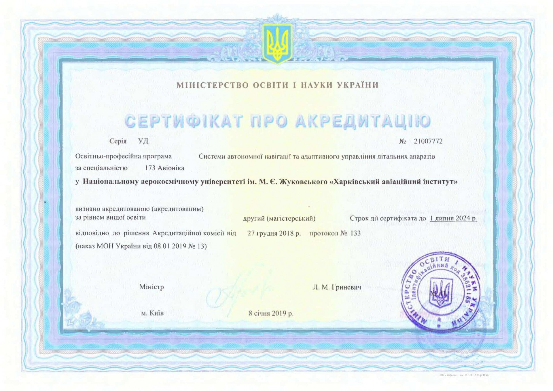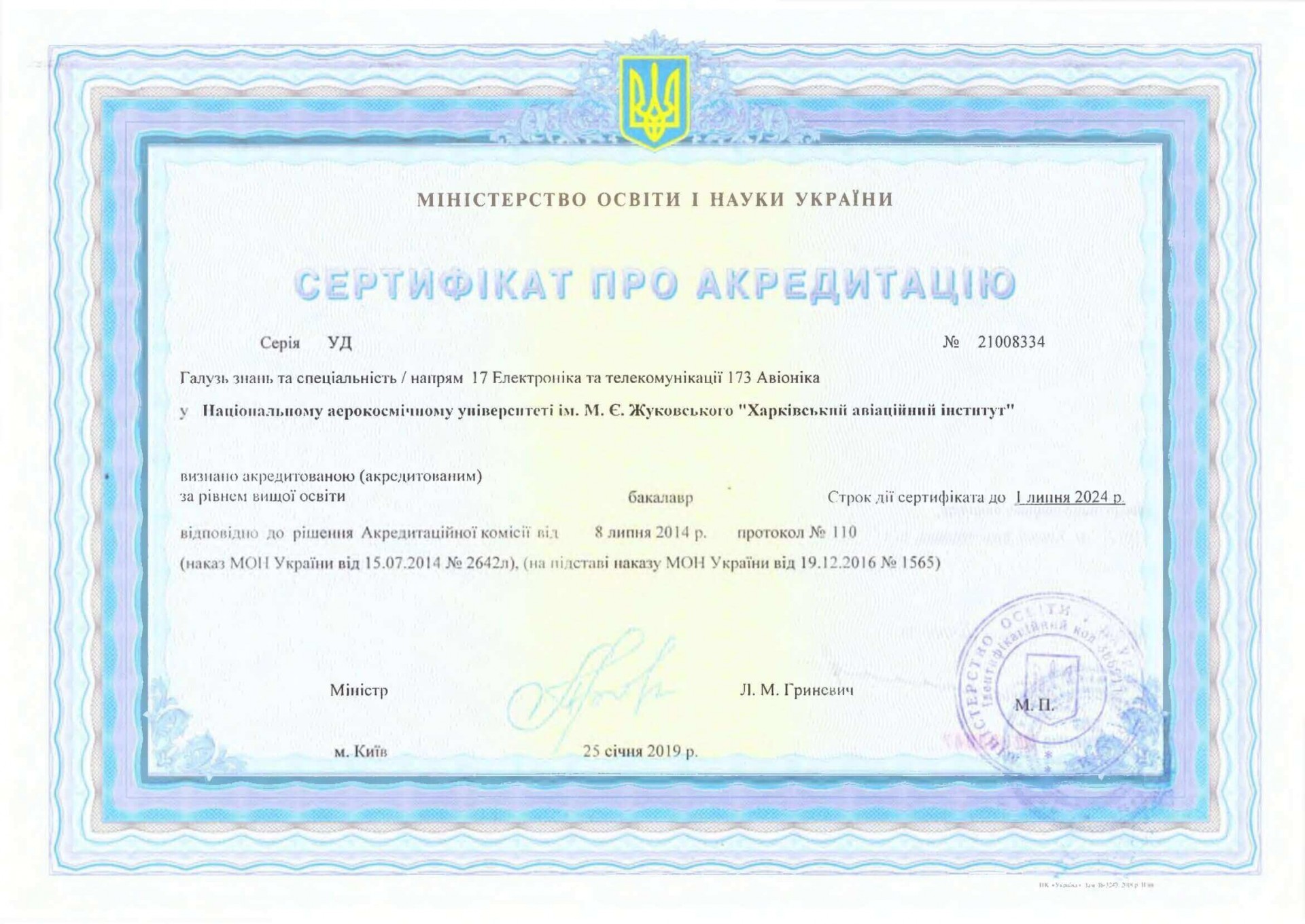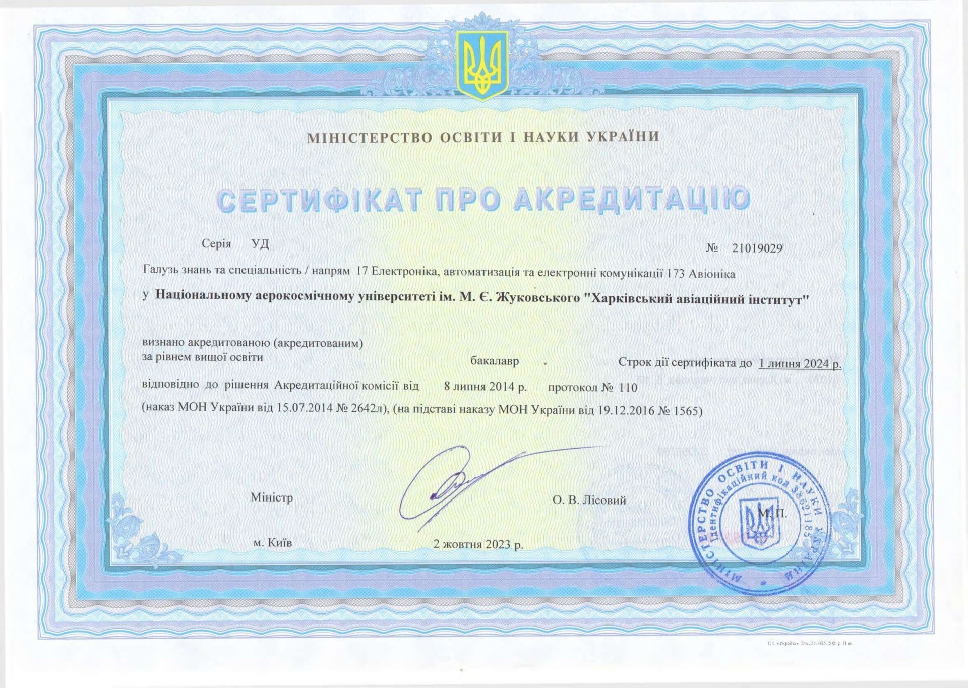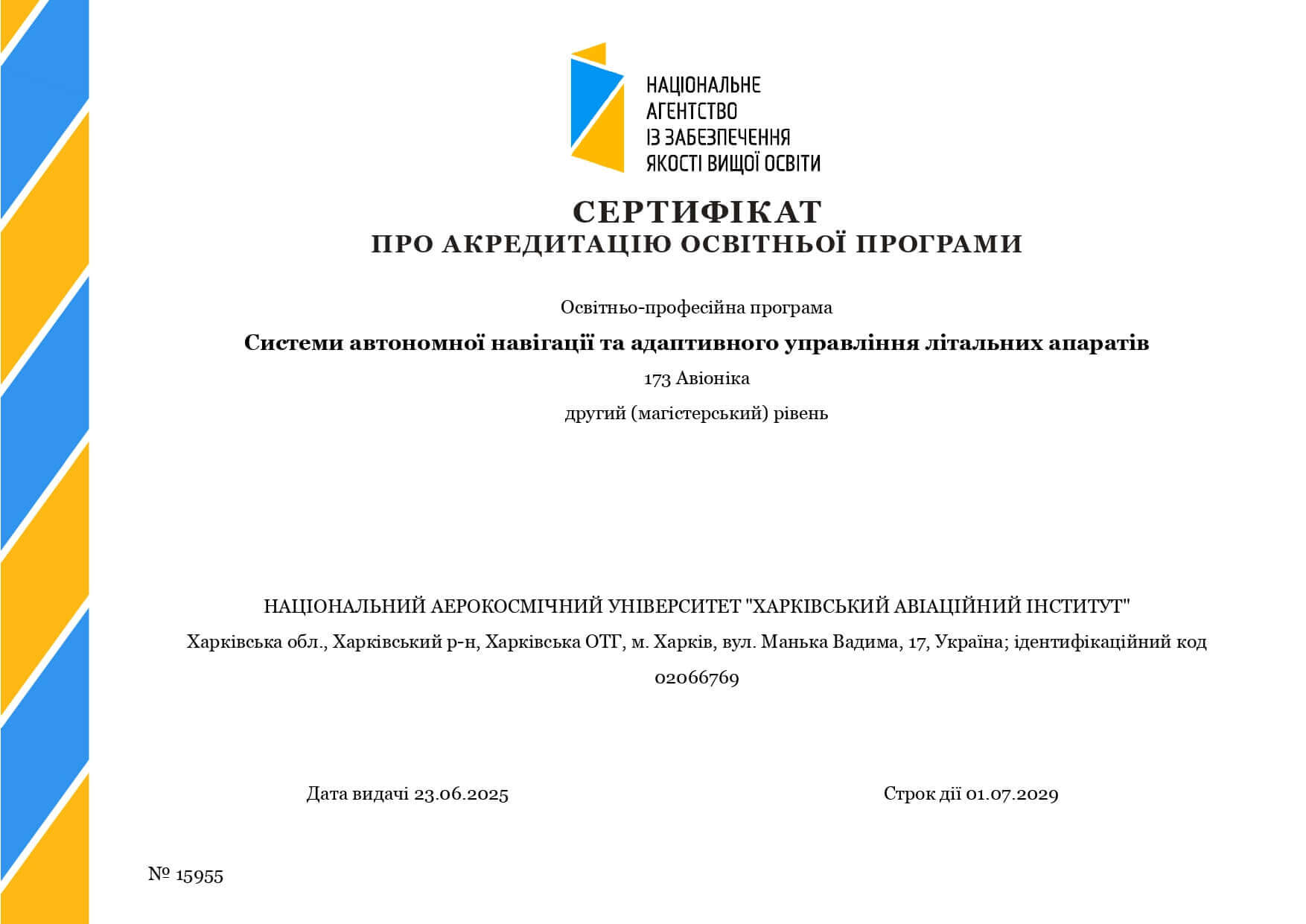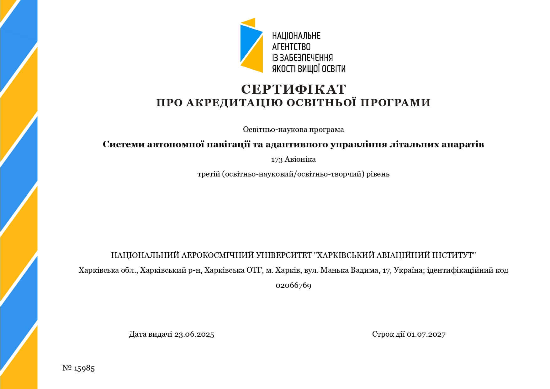 Термін дії сертифікатів про акредитацію спеціальностей/сертифікатів про акредитацію освітніх програм продовжено до 01.06.2026 р. відповідно до пункту 1 Постанови Кабінету Міністрів України «Про особливості акредитації освітніх програм, за якими здійснюють підготовку здобувачі вищої освіти, в умовах воєнного стану» від 16 березня 2022 р. № 295.