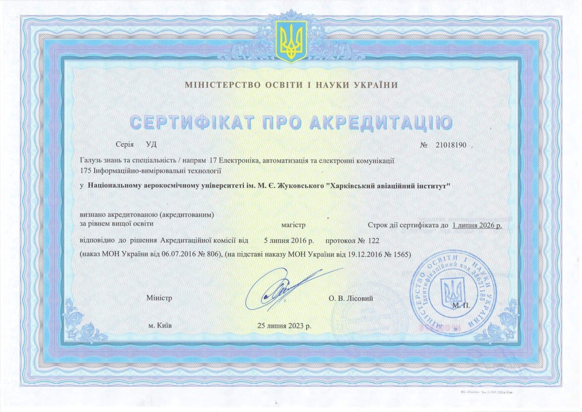 Термін дії сертифікатів про акредитацію спеціальностей/сертифікатів про акредитацію освітніх програм продовжено до 01.06.2026 р. відповідно до пункту 1 Постанови Кабінету Міністрів України «Про особливості акредитації освітніх програм, за якими здійснюють підготовку здобувачі вищої освіти, в умовах воєнного стану» від 16 березня 2022 р. № 295.