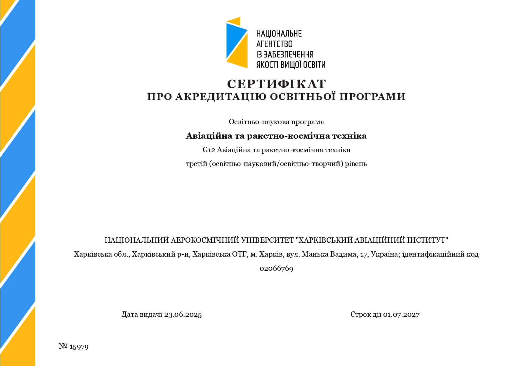 Наявність акредитації: Сертифікат про акредитацію: №15979 від 23 червня 2025 року. Період акредитації: до 01 червня 2027 року. Оновлення або модернізація освітньої програми здійснюється відповідно до розділу 5 Положення «Про розроблення та модернізацію освітніх програм в ХАІ».
