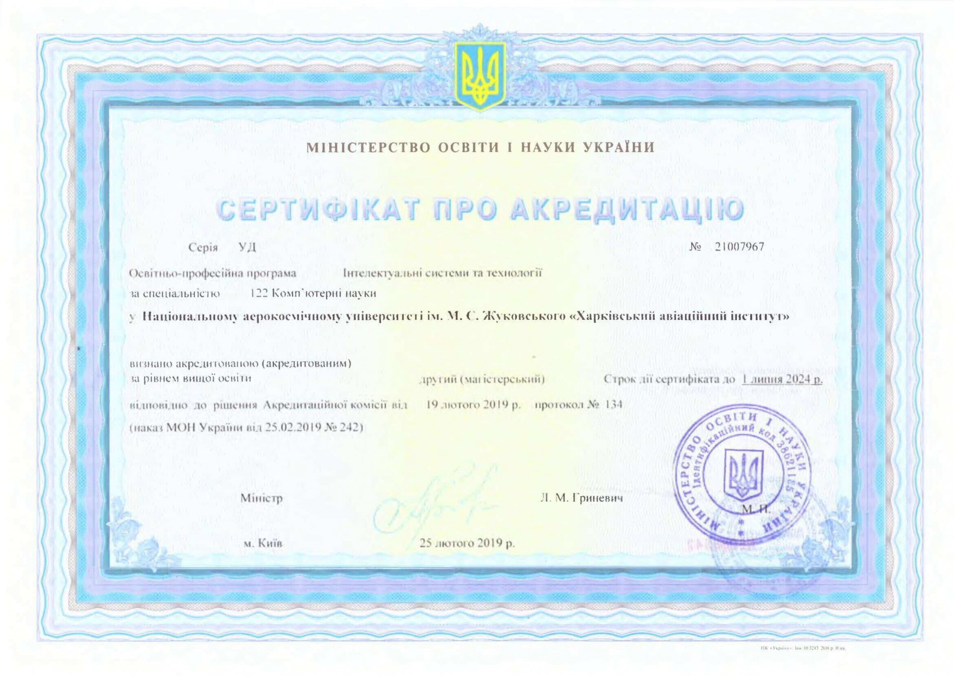 Наявність акредитації: Сертифікат про акредитацію: Серія УД №21007967, виданий 25 січня 2019 року на підставі рішення АК від 19 лютого 2019 року, протокол №134 (наказ МОН України від 25 лютого 2019 року №242). Термін дії до 01 липня 2026 року. Оновлення або модернізація освітньої програми здійснюється відповідно до розділу 5 Положення «Про розроблення та модернізацію освітніх програм в ХАІ».