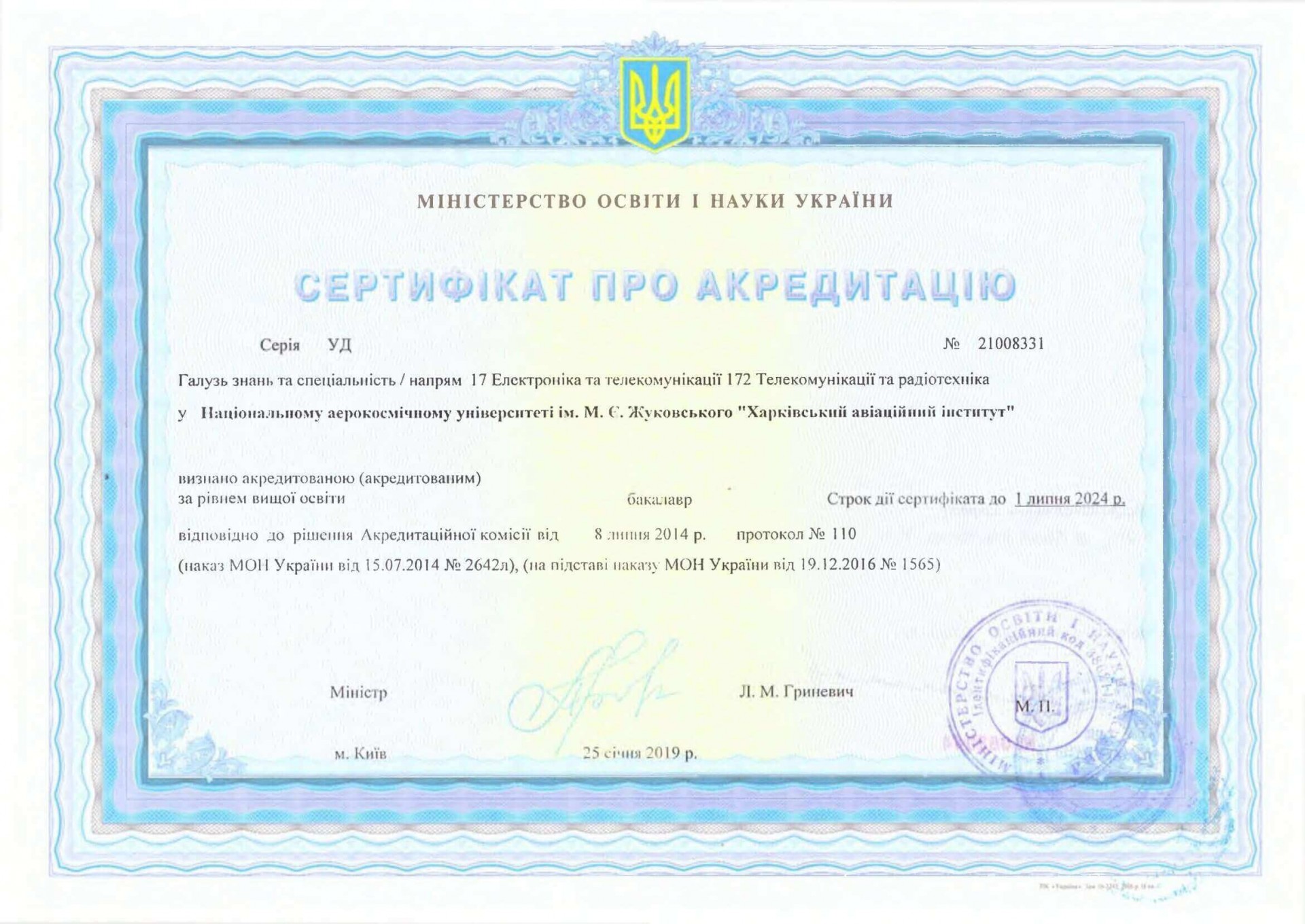Наявність акредитації:Сертифікат про акредитацію: Серія УД № 21008331 виданий 25 січня 2019 року. Термін дії 01 липня 2026 року.