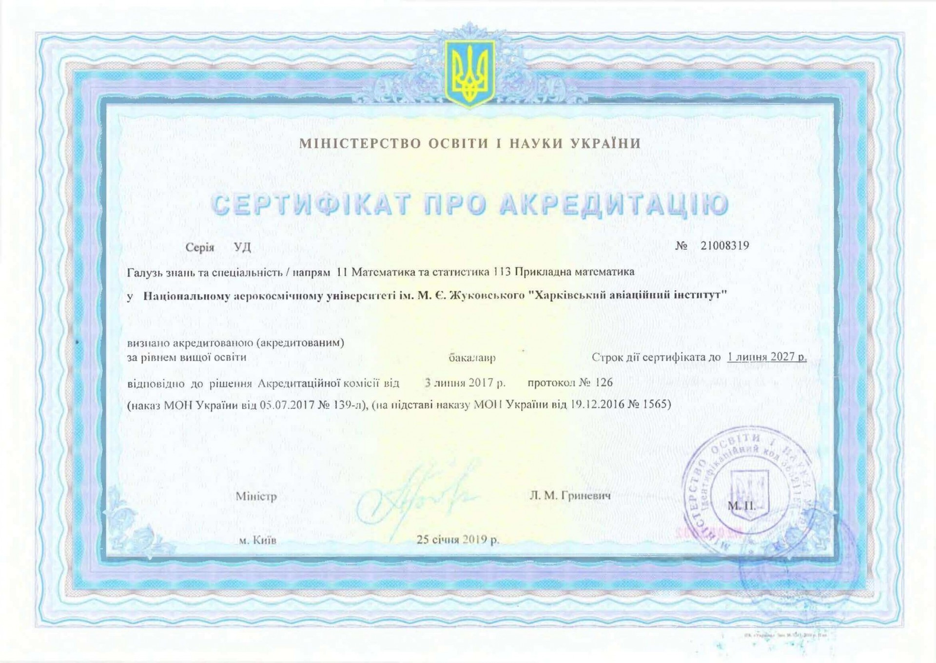 Наявність акредитації:Сертифікат про акредитацію: Серія УД №21008319, виданий 25 січня 2019 року. протокол №126 (наказ МОН України від 05 липня 2017 року №139-л). Термін дії до 01 липня 2027 року. Оновлення або модернізація освітньої програми здійснюється відповідно до розділу 5 Положення «Про розроблення та модернізацію освітніх програм ХАІ».
