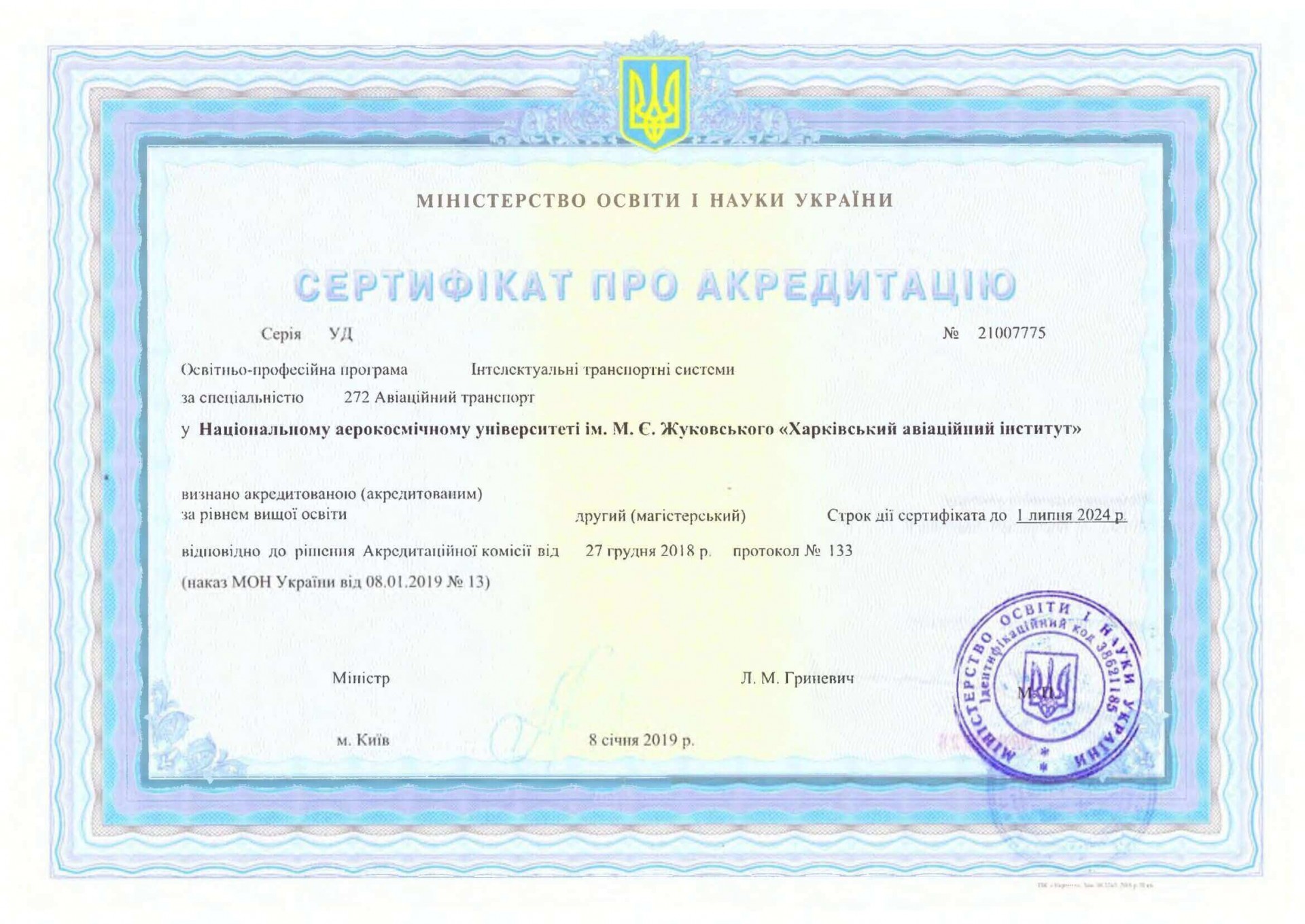 Наявність акредитації: Сертифікат про акредитацію: Серія УД №21007775 від 08 січня 2019 року, виданий на підставі наказу МОН України № 13 від 18 січня 2019 року. Термін дії сертифіката до 01 липня 2026 року. Оновлення або модернізація освітньої програми здійснюється відповідно до розділу 5 Положення «Про розроблення та модернізацію освітніх програм в ХАІ».