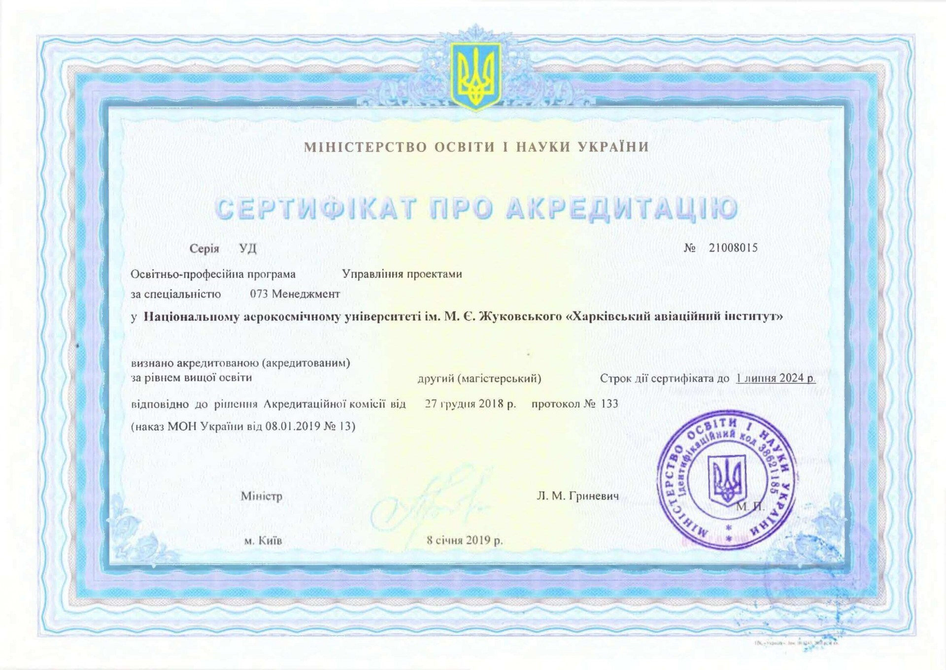 Наявність акредитації:Сертифікат про акредитацію: серія УД №21008015 виданий 08 січня 2019 року на підставі наказу МОН України від 08 січня 2019 року №13. Термін дії до 01 липня 2025 року. Оновлення або модернізація освітньої програми здійснюється відповідно до розділу 5 Положення «Про розроблення та модернізацію освітніх програм в ХІА».