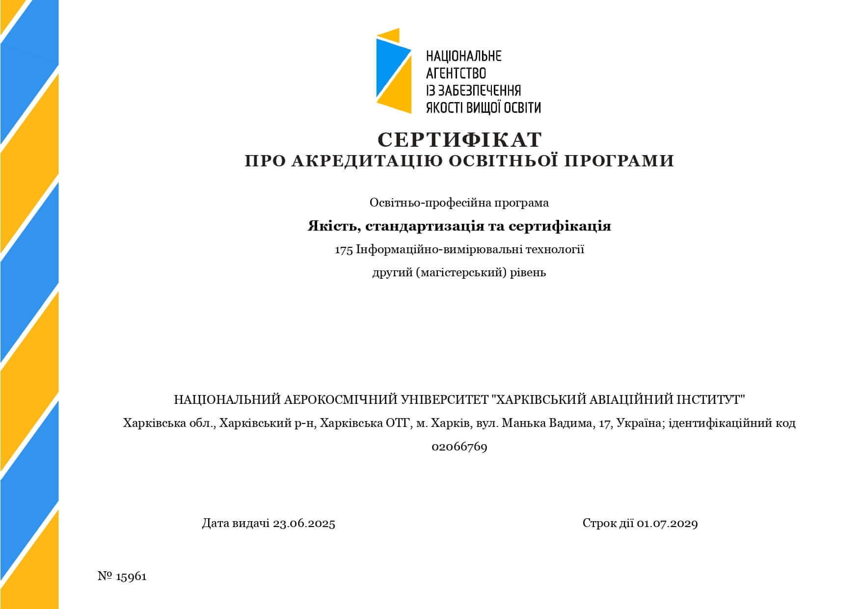 Наявність акредитації: Сертифікат про акредитацію: №15961, виданий 23 червня 2025 року. Термін дії до 01 липня 2029 року. Оновлення або модернізація освітньої програми здійснюється відповідно до розділу 5 Положення «Про розроблення та модернізацію освітніх програм в ХАІ».