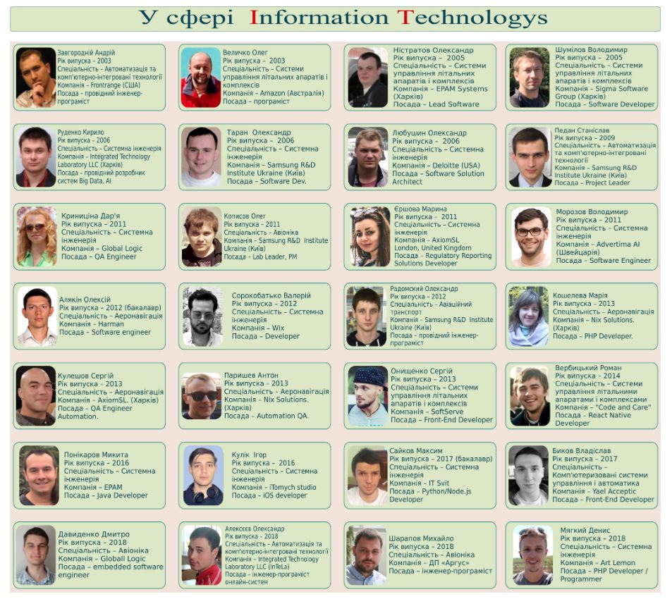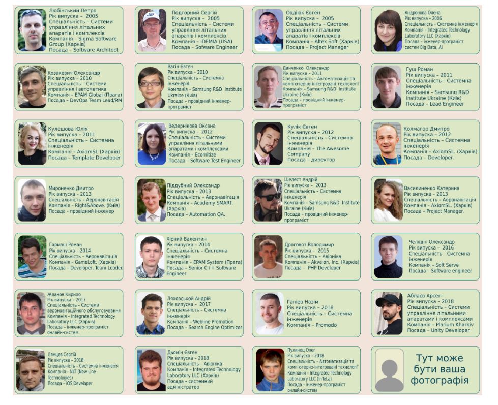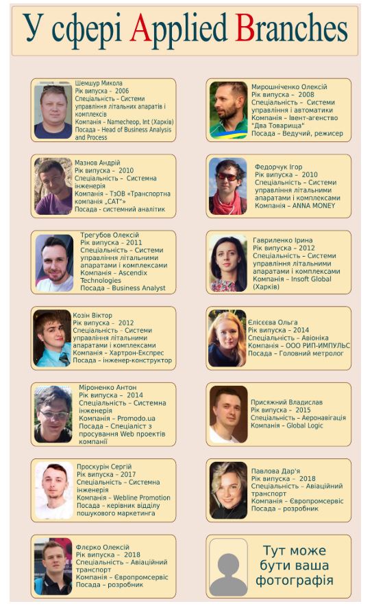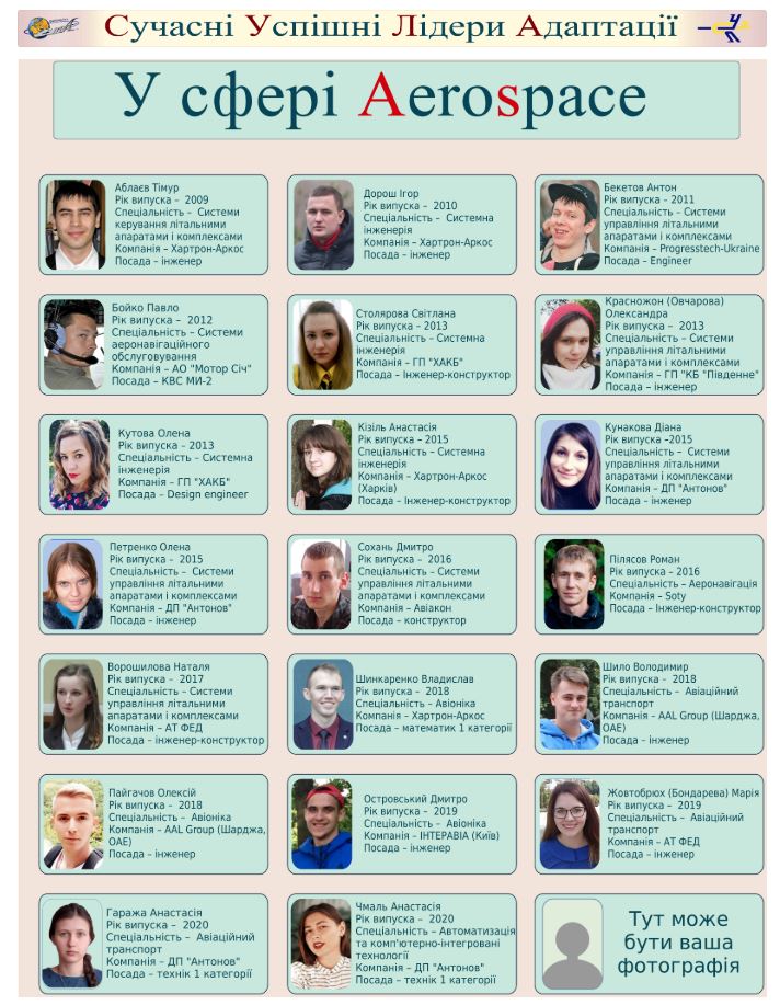 Кафедра за 60 років існування підготувала «3593 фахівця вищої кваліфікації». На дошці представлено 88 колишніх студентів ХАІ (з 2003 р.). Вони реалізували свої професійні амбіції в трьох галузях: Aerospace, Applied Branches, Information Technology. У кінці кожного блоку є додаткове вільне місце: «Тут може бути ваша фотографія».