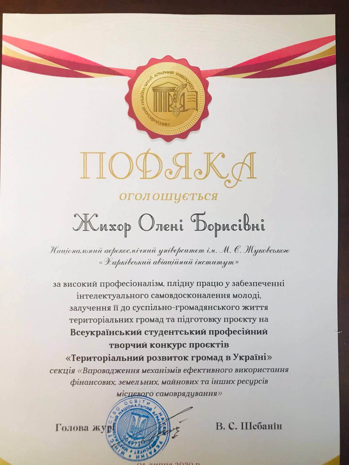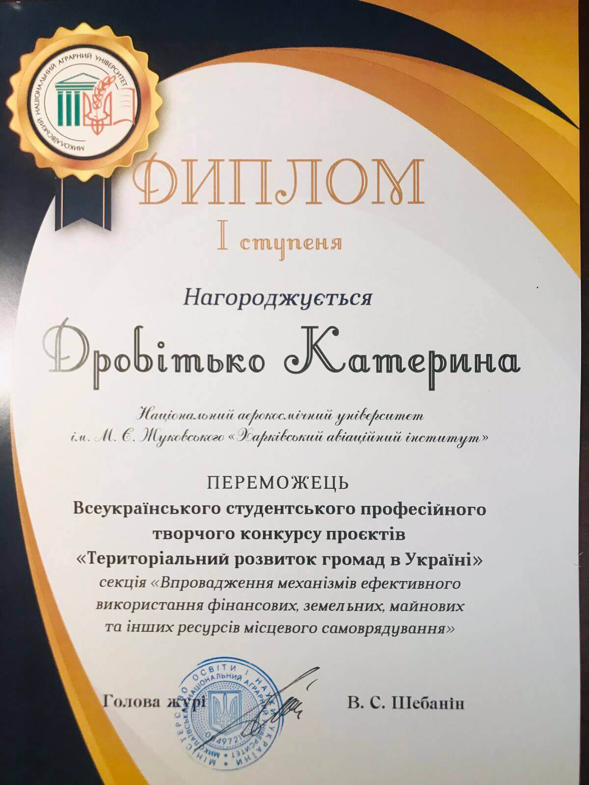 Вітаємо студентку кафедри публічного управління та підприємництва Дробітько Катерину з перемогою – зі здобуттям Диплому I ступеню, а також її наукового керівника – завідувача кафедри публічного управління та підприємництва Жихор Олену Борисівну!