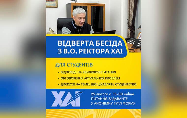 25 лютого о 15:00 запрошуємо доєднатися студентство ХАІ до online зустрічі з в.о. ректора Олексієм ЛИТВИНОВИМ.