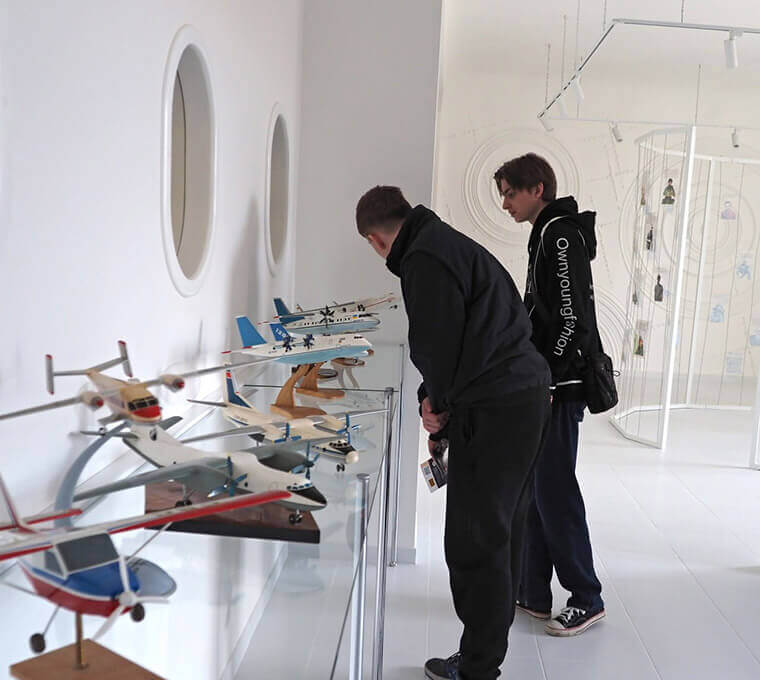 Авіа- та автотехніка: модель літака, ракета, авіасимулятор, моделі двигунів (Rolls-Royce Trent 900, Стірлінга, газотурбінний), безпілотник у захисній оболонці, стенд керування рульовими поверхнями ЛА «Безхвостка».