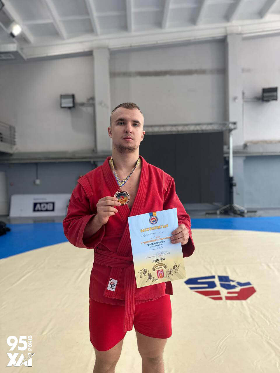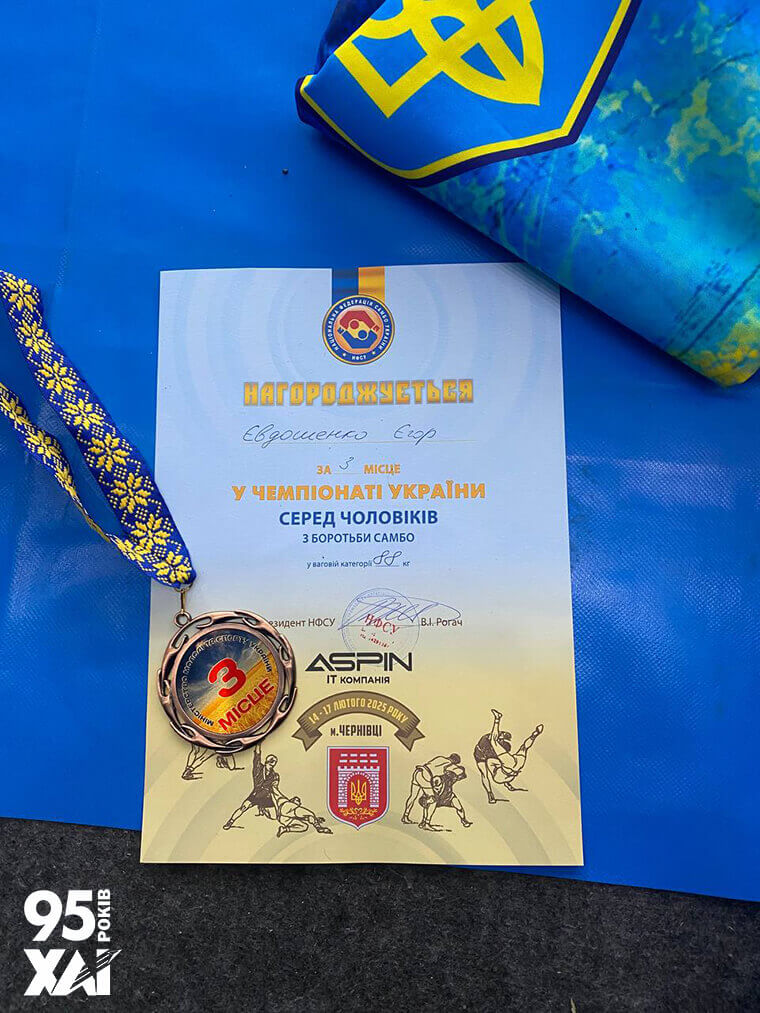 Серед кращих борців яскраво проявив себе студент факультету Систем управління літальних апаратів Національного аерокосмічного університету «ХАІ» Єгор ЄВДОШЕНКО. Ведучи напружені поєдинки, він продемонстрував залізний характер, блискавичну техніку та незламний бойовий дух. Як результат – ЗАСЛУЖЕНА БРОНЗОВА МЕДАЛЬ ТА ВИКОНАНИЙ НОРМАТИВ МАЙСТРА СПОРТУ УКРАЇНИ!