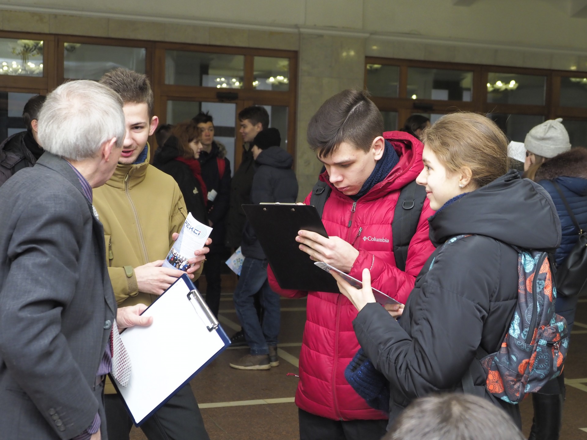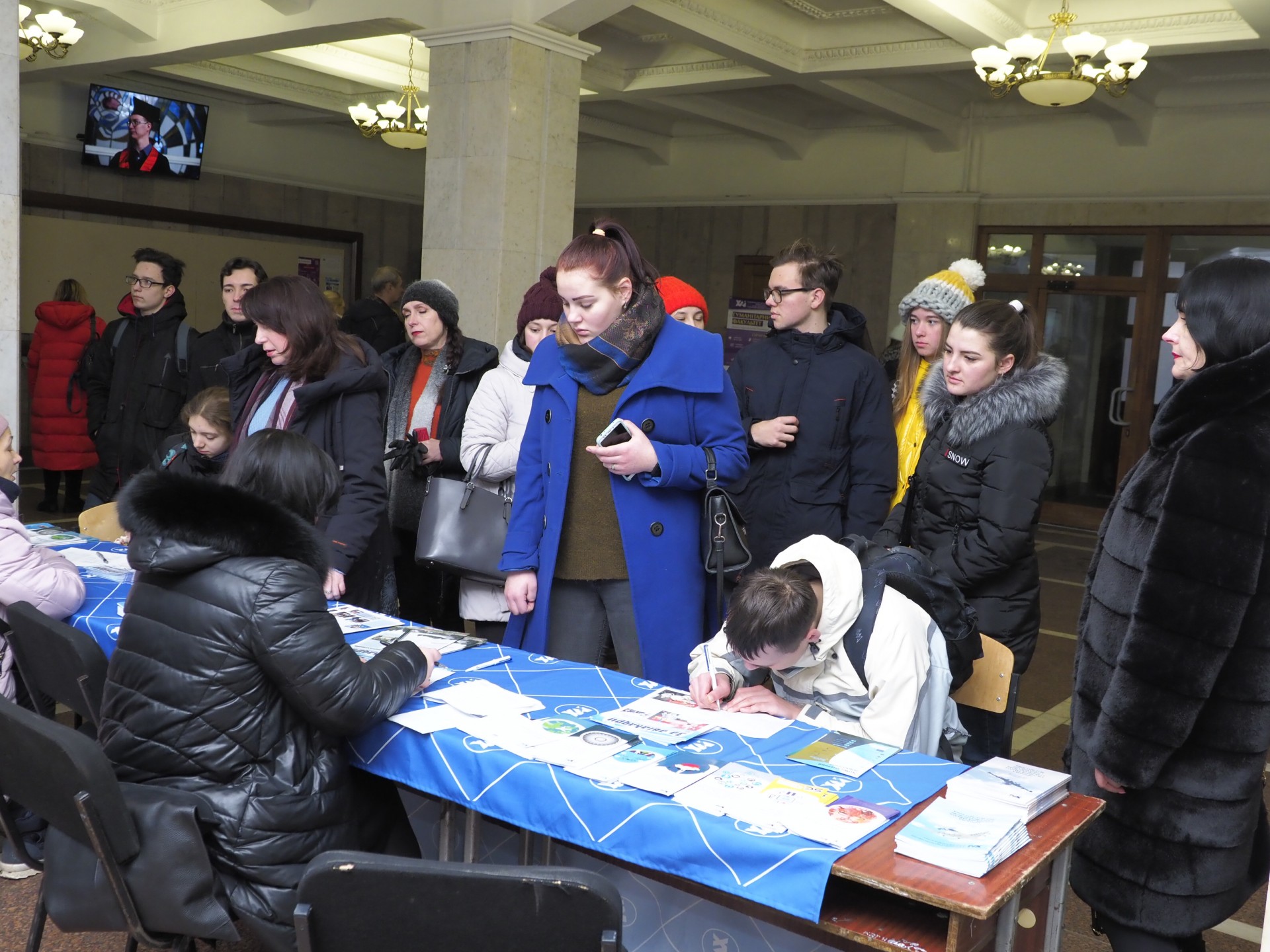 Уже близько 9 ранку у вестибюлі головного корпусу потроху збиралися підлітки в супроводі своїх батьків і вчителів, щоб вирішити, на які факультети подавати заявки.