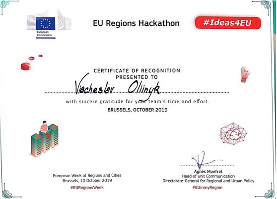 З 10 по 14 жовтня в рамках Європейської неділі регіонів і міст проведено хакатон інноваційних технологій «TADHack Global 2019», на якому аспірант кафедри 504 ХАІ В'ячеслав Олійник посів перше місце.