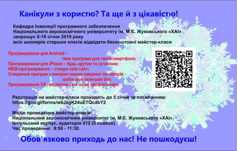 Кафедра інженерії програмного забезпечення Національного аерокосмічного університету ім. М. Є. Жуковського «ХАІ» запрошує 8-10 січня усіх бажаючих школярів старших класів на майстер-класи з сучасних IT-технологій та розроблення програмного забезпечення