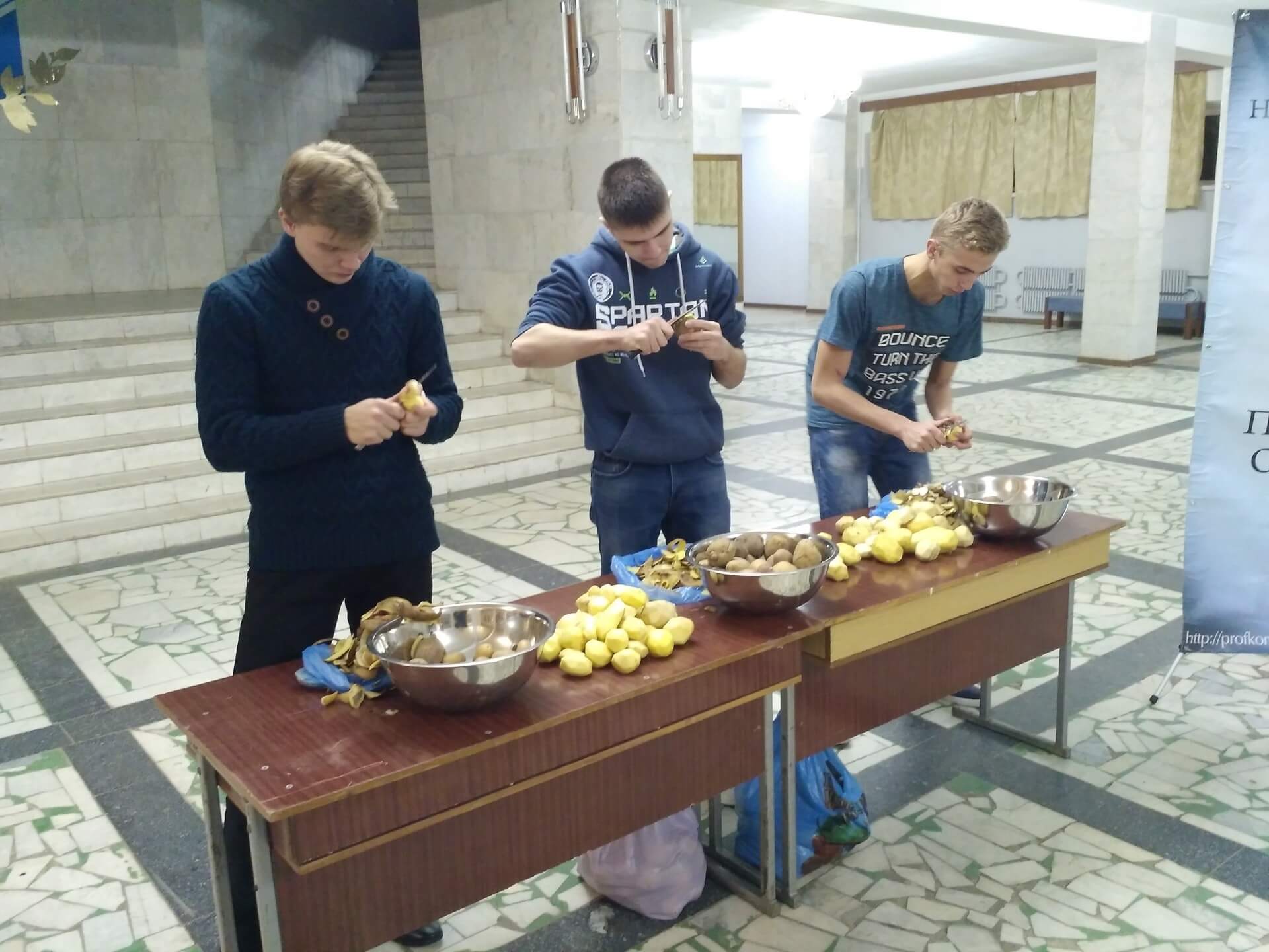 Перший конкурс полягав у чищенні дарів природи на швидкість, другий – у швидкісному поїданні картоплі-фрі, третій – у будівництві піраміди з 90 одиниць натурального продукту. До речі, останнє змагання було присвячено ювілею нашого університету, який буде у 2020 році.