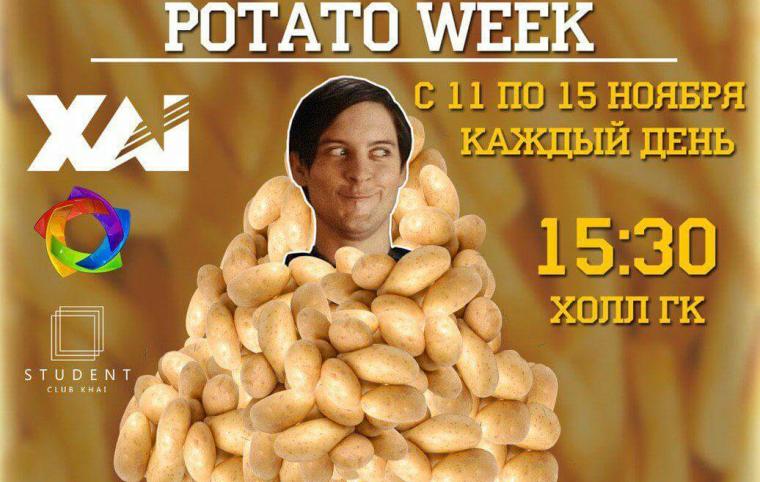 З 11 по 15 листопада у ХАІ проходить Potato Week. Кожен день у холі головного корпусу о 15:30 починається нове змагання, так чи інакше пов’язане з «експлуатацією» картоплі.