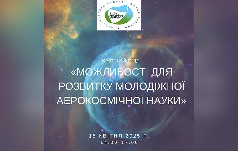 Рада молодих учених при Міністерстві освіти і науки України організовує круглий стіл на тему: «Можливості для розвитку молодіжної аерокосмічної науки», що відбудеться в змішаному форматі 15 квітня 2025 р. з 14.00 до 17.00.