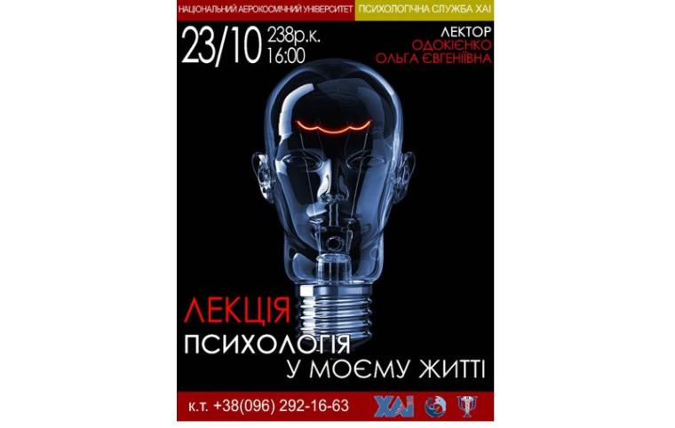 23 жовтня о 16:00 в аудиторії 238 радіокорпусу відбудеться відкрита лекція на тему: «Психологія у моєму житті». Лектор – психолог ХАІ Одокієнко Ольга Євгеніївна.