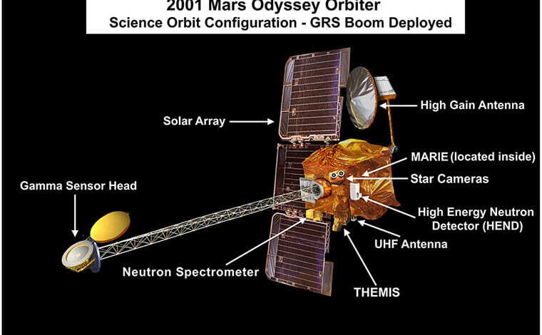 - GRS (Gamma Ray Spectrometer) – гамма-спектрометр, що допоміг виявити на Марсі масивні поклади льоду в районі марсіанського екватора. Це заморожена брила товщиною 3,7 кілометра. Якщо її розтопити - вона вкриє Червону планету двометровим шаром води.