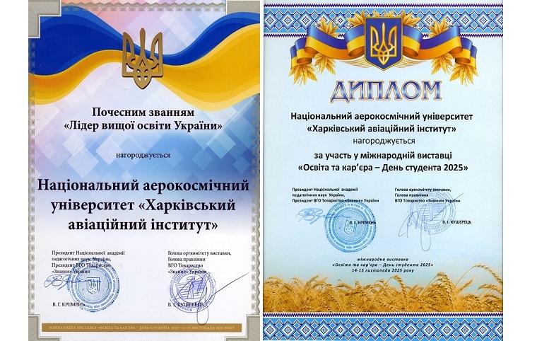 Національний аерокосмічний університет «Харківський авіаційний інститут» отримав відразу дві почесні нагороди на міжнародній виставці «Освіта та кар’єра – День студента 2025», що відбулася 14–15 листопада в Києві.
