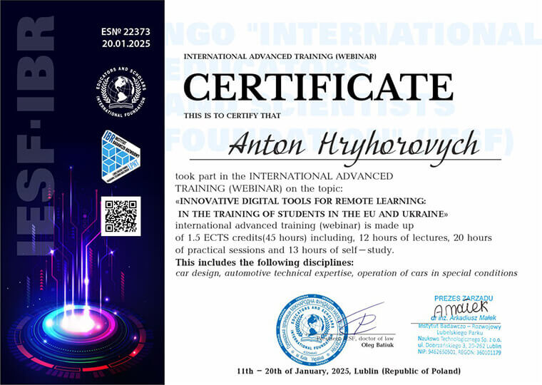 Викладачі Кафедри автомобілів та транспортної інфраструктури (107) – завідувачка кафедри, доцент Наталія КОБРІНА та старший викладач Антон ГРИГОРОВИЧ – пройшли навчання та успішно склали сертифікаційний іспит за темою «ІННОВАЦІЙНІ ЦИФРОВІ ІНСТРУМЕНТИ ДЛЯ ДИСТАНЦІЙНОГО НАВЧАННЯ: ПРИ ПІДГОТОВЦІ ЗДОБУВАЧІВ ОСВІТИ В КРАЇНАХ ЄВРОПЕЙСЬКОГО СОЮЗУ ТА В УКРАЇНІ», організаторами якого стали Науково-дослідний Інститут Люблінського науково-технологічного парку (Польща) та Міжнародна фундація науковців та освітян IESF.