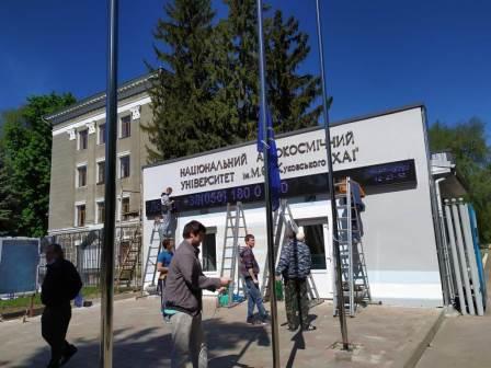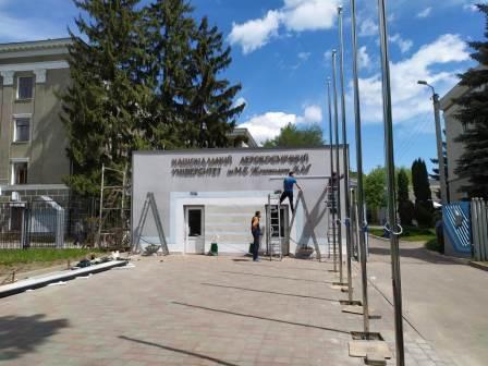 Сьогодні, 15 травня, перед головною прохідною нашого університету бригада робітників встановила флагштоки з прапорами, а також рухомий рядок з привітальними словами й інформаційні стенди.