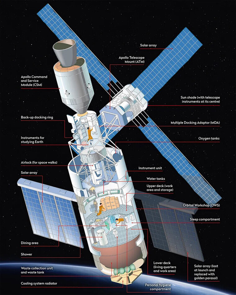 14 травня 1973 року ракетоносій Saturn V вивів на орбіту першу в історії США орбітальну космічну станцію — Skylab. Її концепцію розробив один із головних архітекторів американської космічної програми — Вернер фон Браун, який прагнув продовжити практичне використання напрацювань програми «Аполлон». Після завершення місячних місій у NASA залишилися невикористані кораблі та ракети, ідея створення орбітальної лабораторії стала логічним наступним кроком.