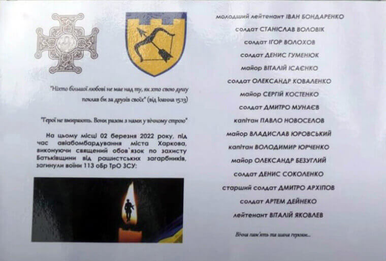«На цьому місці 2 березня 2022 року під час авіабомбардування міста Харкова, виконуючи священний обов'язок по захисту Батьківщини від рашистських загарбників, загинули воїни 113 ОБР ТРО ЗСУ: