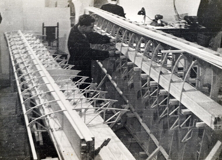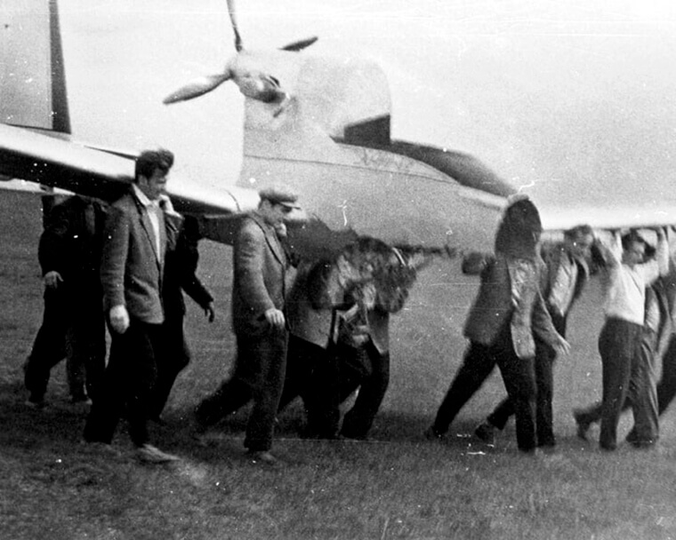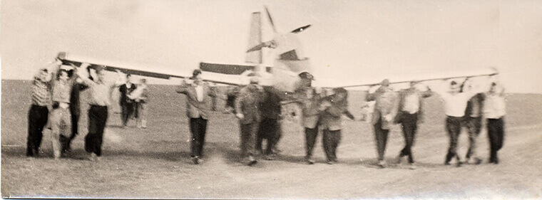 На історичних фото того дня (вибачаємося за якість знімка — але саме такою була світлина 66 років тому) студенти-конструктори на руках несуть із літного поля пошкоджену машину.