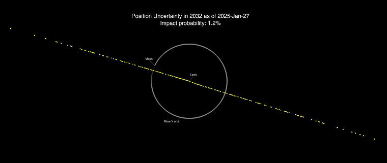 - Астероїд 2024 YR4, зафіксований 27 січня 2025 року. Зображення зроблено телескопом Magdalena Ridge 2,4 м — одним із найбільших телескопів у мережі захисту планети NASA