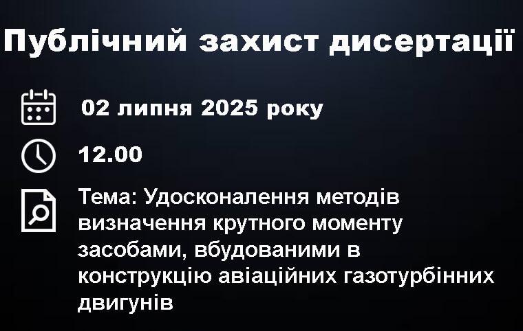 2 липня 2025 року о 12.00 у Національному аерокосмічному університеті «Харківський авіаційний інститут» у режимі онлайн-конференції відбудеться публічний захист дисертації Костянтина Подгорського на здобуття ступеня доктора філософії в галузі знань 14 Електрична інженерія за спеціальністю 142 Енергетичне машинобудування на тему «Удосконалення методів визначення крутного моменту засобами, вбудованими в конструкцію авіаційних газотурбінних двигунів».