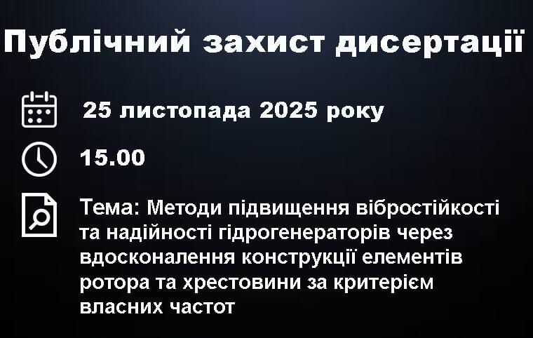 25 листопада 2025 року о 15.00 у Національному аерокосмічному університеті «Харківський авіаційний інститут» у режимі онлайн-конференції відбудеться публічний захист дисертації Марії Арефьєвої на здобуття ступеня доктора філософії в галузі знань 13 Механічна інженерія за спеціальністю 134 Авіаційна та ракетно-космічна техніка на тему «Методи підвищення вібростійкості та надійності гідрогенераторів через вдосконалення конструкції елементів ротора та хрестовини за критерієм власних частот».
