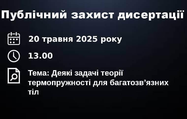 20 червня 2025 року о 13.00 у Національному аерокосмічному університеті «Харківський авіаційний інститут» у режимі онлайн-конференції відбудеться публічний захист дисертації Марії Скіцка на здобуття ступеня доктора філософії в галузі знань 11 Математика і статистика за спеціальністю 113 Прикладна математика на тему «Деякі задачі теорії термопружності для багатозв’язних тіл».