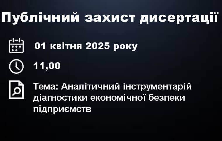 01 квітня 2025 року об 11.00 у Національному аерокосмічному університеті ім. М. Є. Жуковського «Харківський авіаційний інститут» у режимі онлайн-конференції відбудеться публічний захист дисертації Віти Нор на здобуття ступеня доктора філософії в галузі знань 05 Соціальні та поведінкові науки за спеціальністю 051 Економіка на тему «Аналітичний інструментарій діагностики економічної безпеки підприємств».