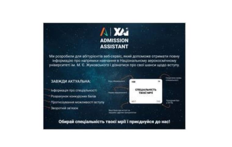 Бажаєте отримати вищу освіту? Обираєте між різними вишами і спеціальностями? Отримали свої результати ЗНО і вам потрібно дізнатися про свої можливості і шанси щодо вступу? Ми розробили для вас веб-сервіс «Асистент при вступі до ХАІ», де ви можете отримати актуальну і повну інформацію про напрямки навчання в ХАІ, розрахувати конкурсний бал і оцінити шанси вступити на спеціальність своєї мрії, отримати зворотній зв’язок. Долучайтеся до нас, якщо ви: випускник школи, коледжу, або вступаєте до магістратури чи аспірантури.